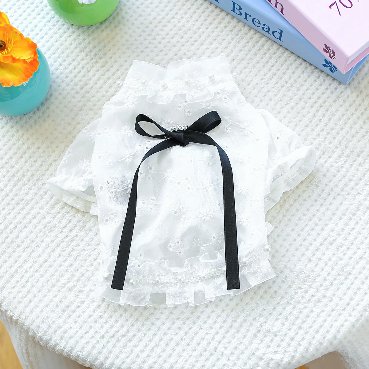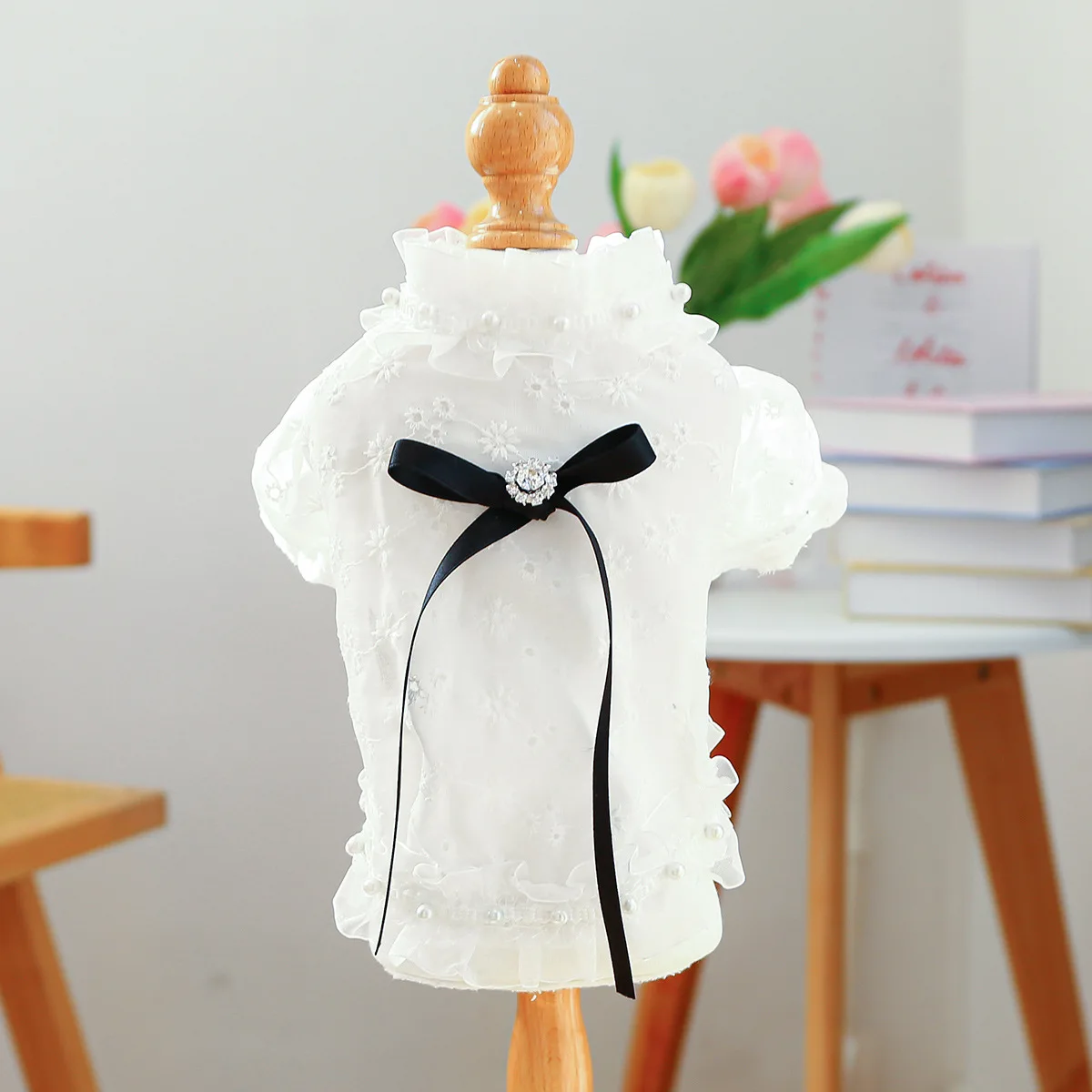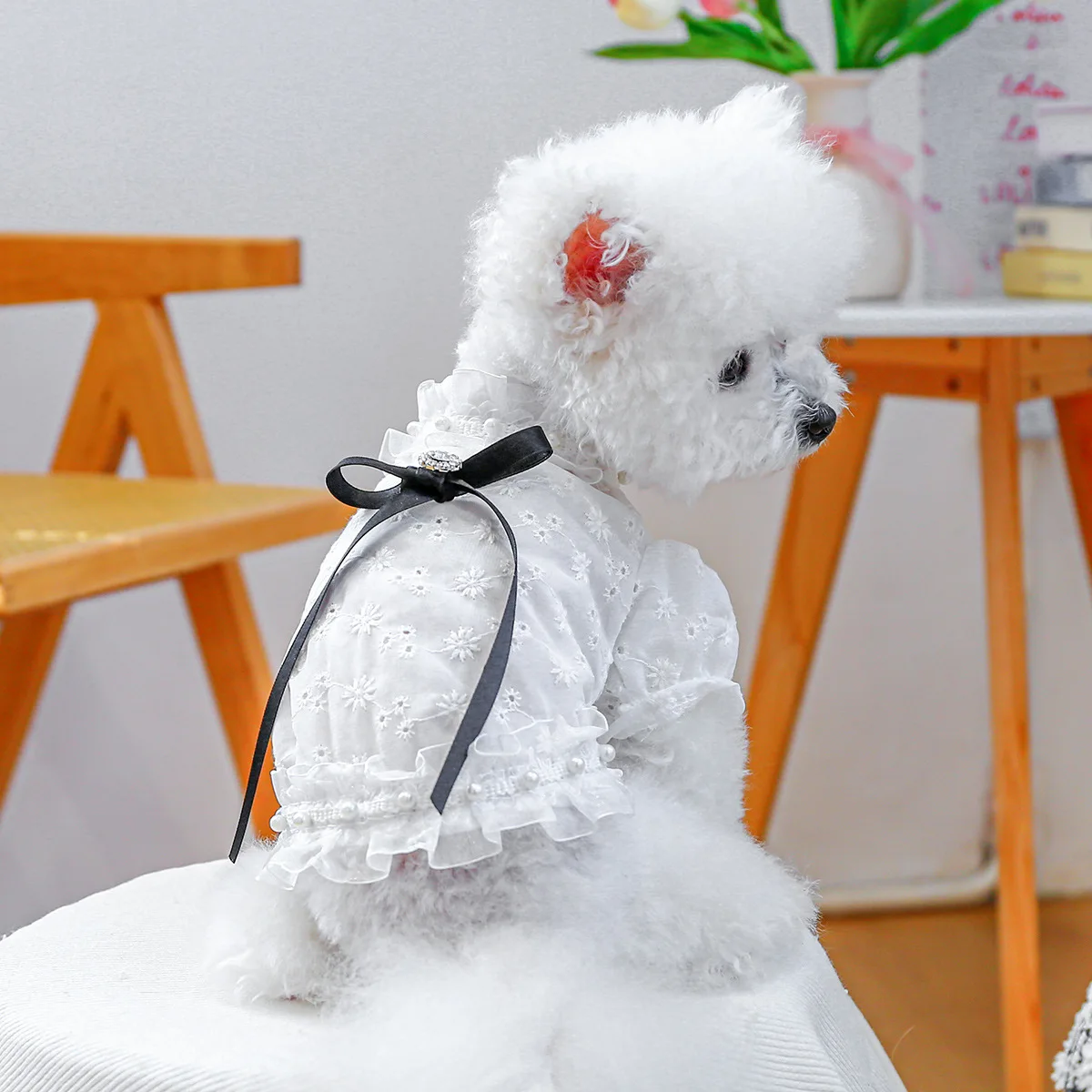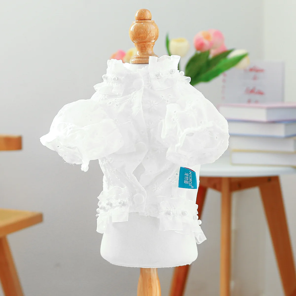 Camisa de manga de burbuja con cuello alto de encaje para mascotas, ropa para perros, camiseta con lazo ahuecado, ropa para mascotas, ropa para cachorros