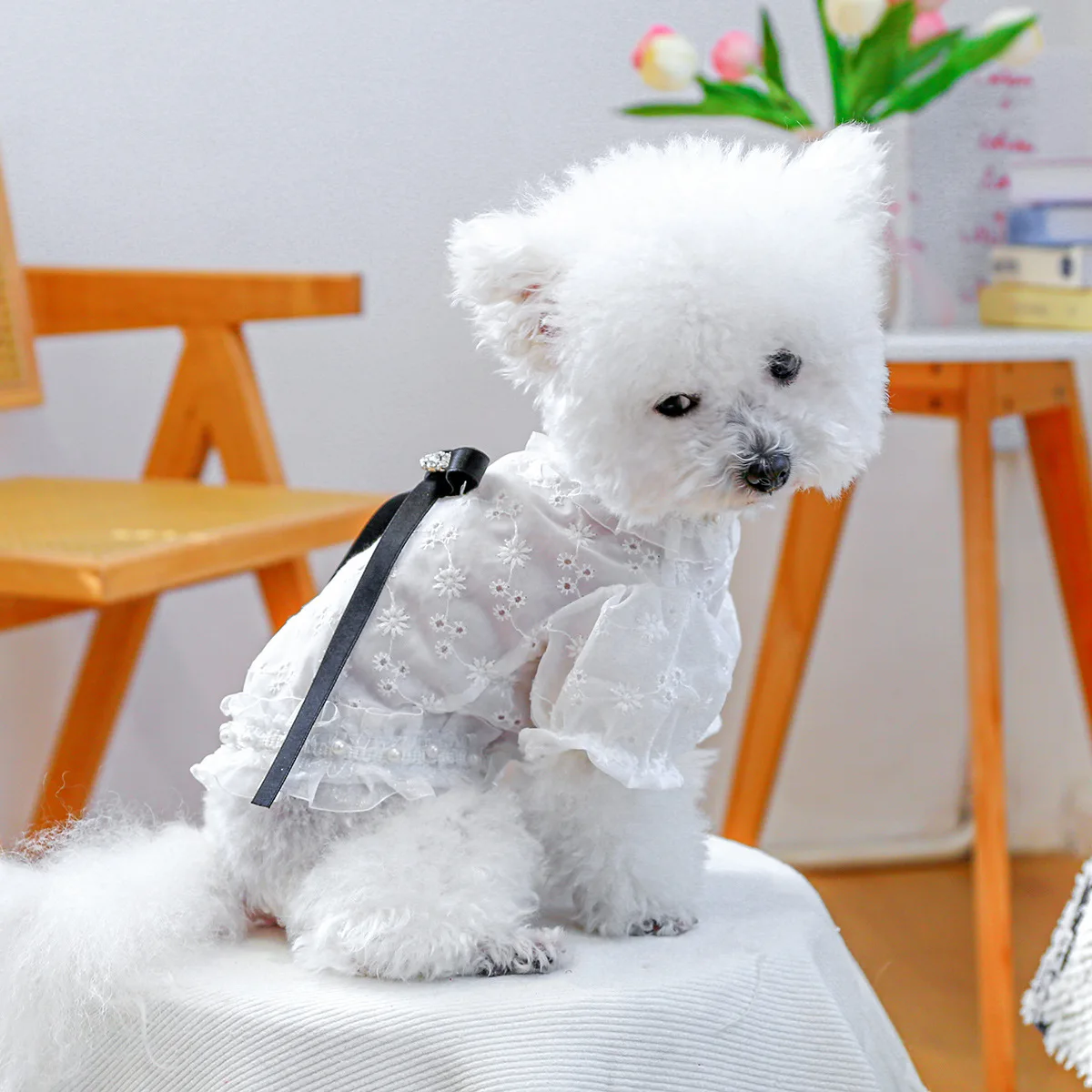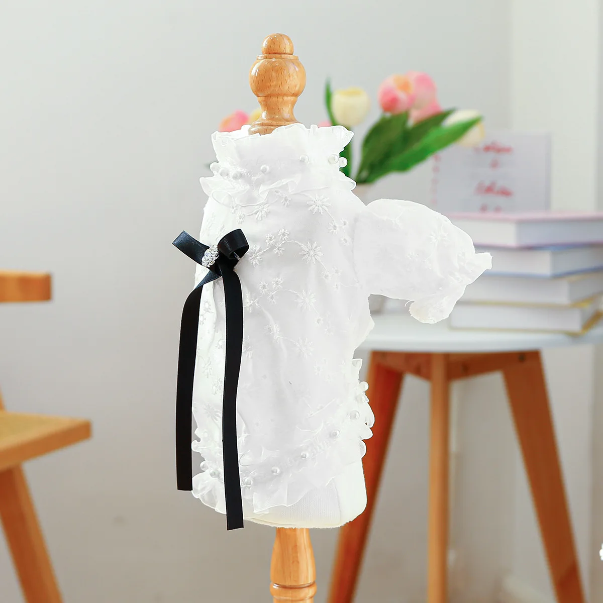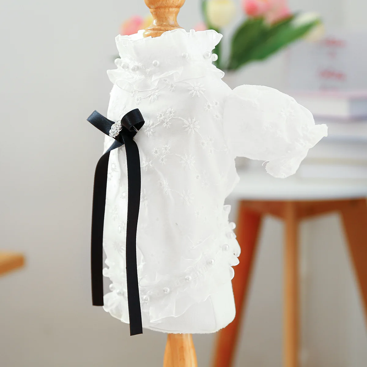 Camisa de manga de burbuja con cuello alto de encaje para mascotas, ropa para perros, camiseta con lazo ahuecado, ropa para mascotas, ropa para cachorros