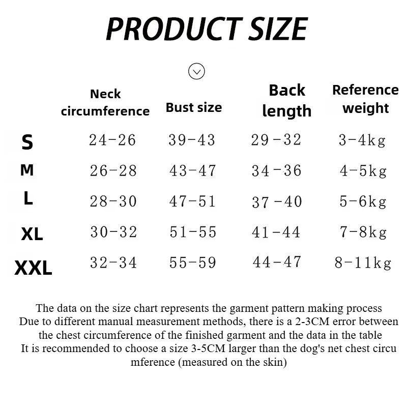 Los datos en la tabla de tallas representan el proceso de confección del patrón de prendas. Debido a los diferentes métodos de medición manual, existe un error de 2-3 cm entre la circunferencia del pecho de la prenda terminada y los datos en la tabla. Se recomienda elegir una talla 3-5 CM más grande que la circunferencia neta del pecho del perro (medida en la piel).