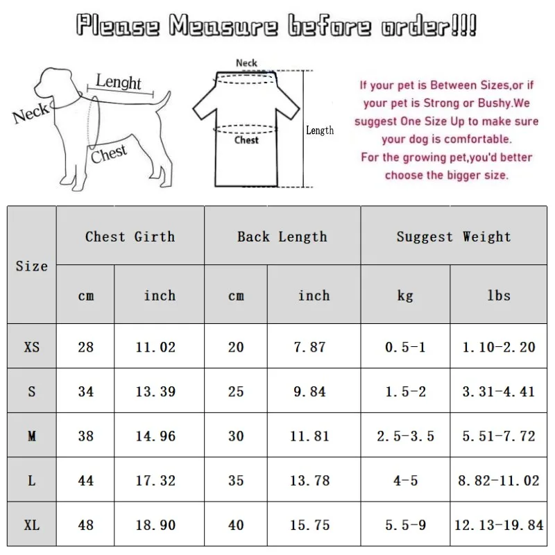XL: Pecho 48 cm/18,9 ''; Longitud 40 cm/15,75 ''; Peso sugerido 5,5-9 kg/12,13-19,84 lbs.