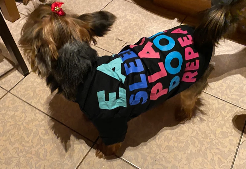 el es un Chihuahua pesa 1900grs le quedó exelente la talla S