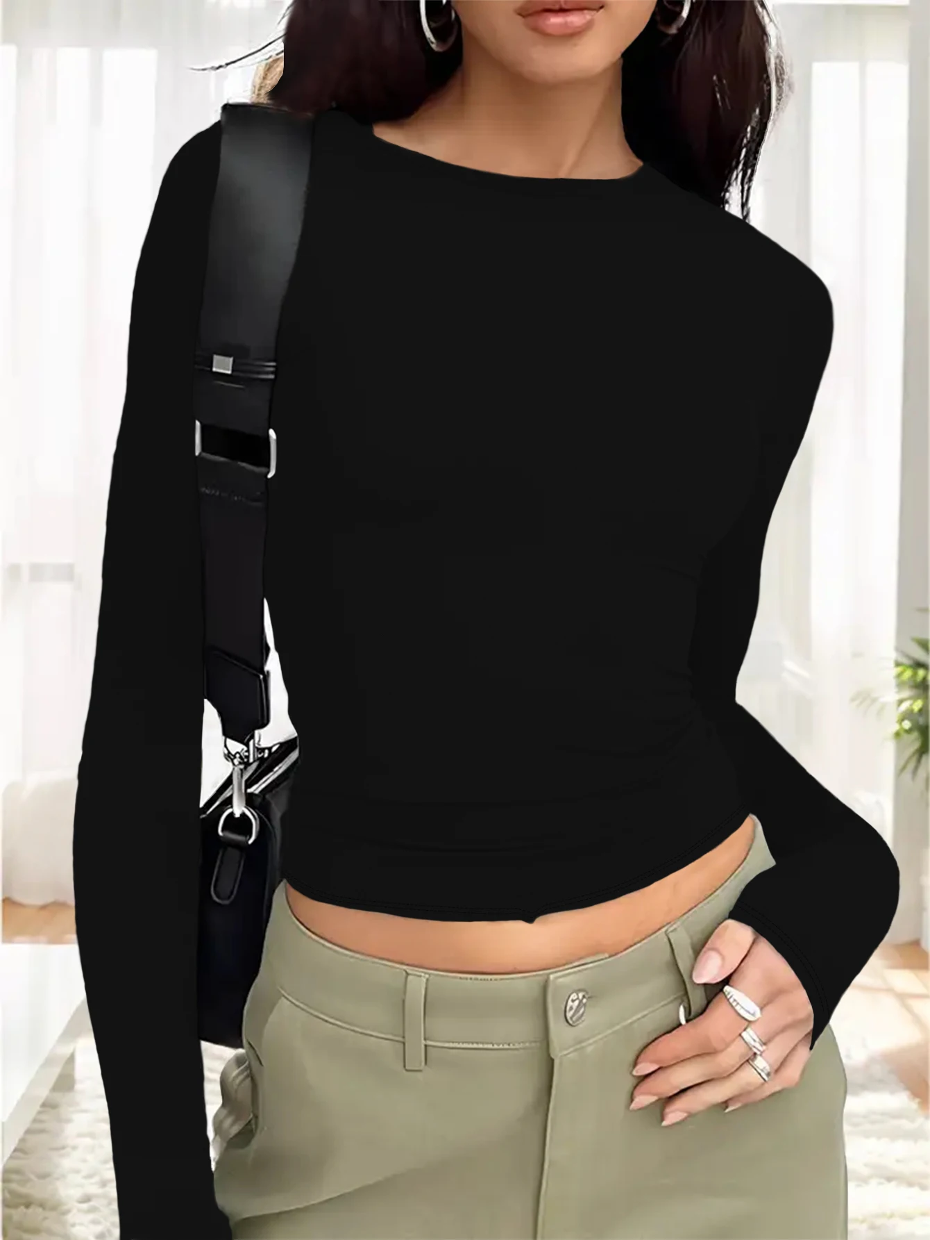 Camiseta casual de manga larga con cuello redondo para mujer, tela suave, uso diario, ropa ajustada para mujer para primavera y otoño