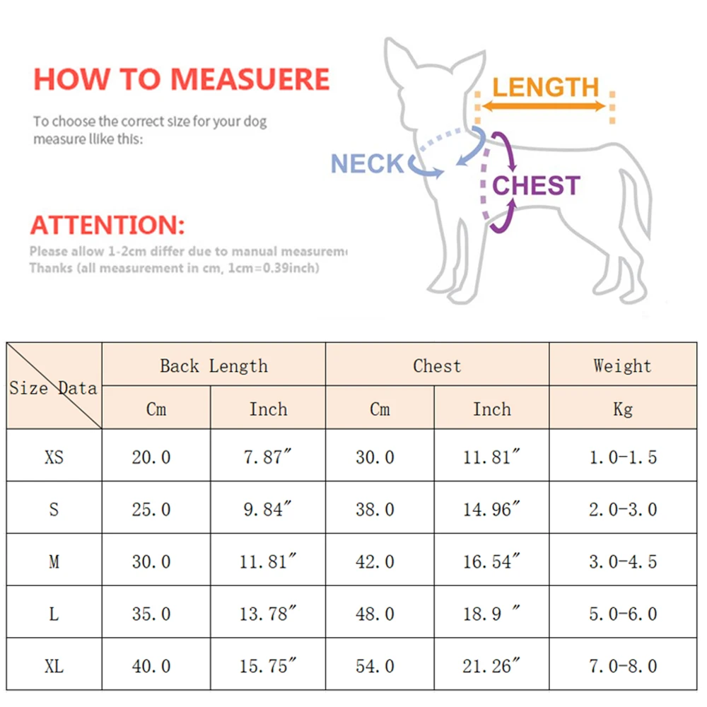 1. Por favor, compruebe las medidas de su mascota para asegurarse de que la ropa se ajuste a las mascotas antes de realizar el pedido (1 pulgada=2,54 cm)