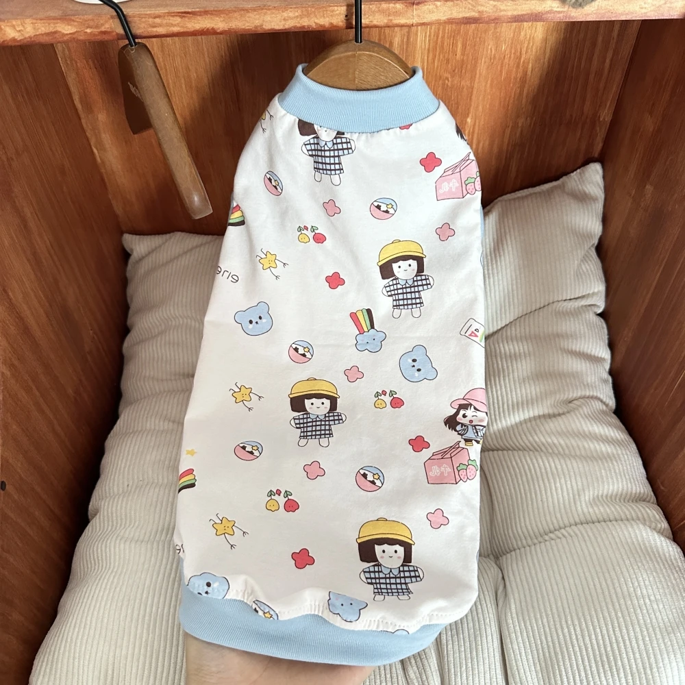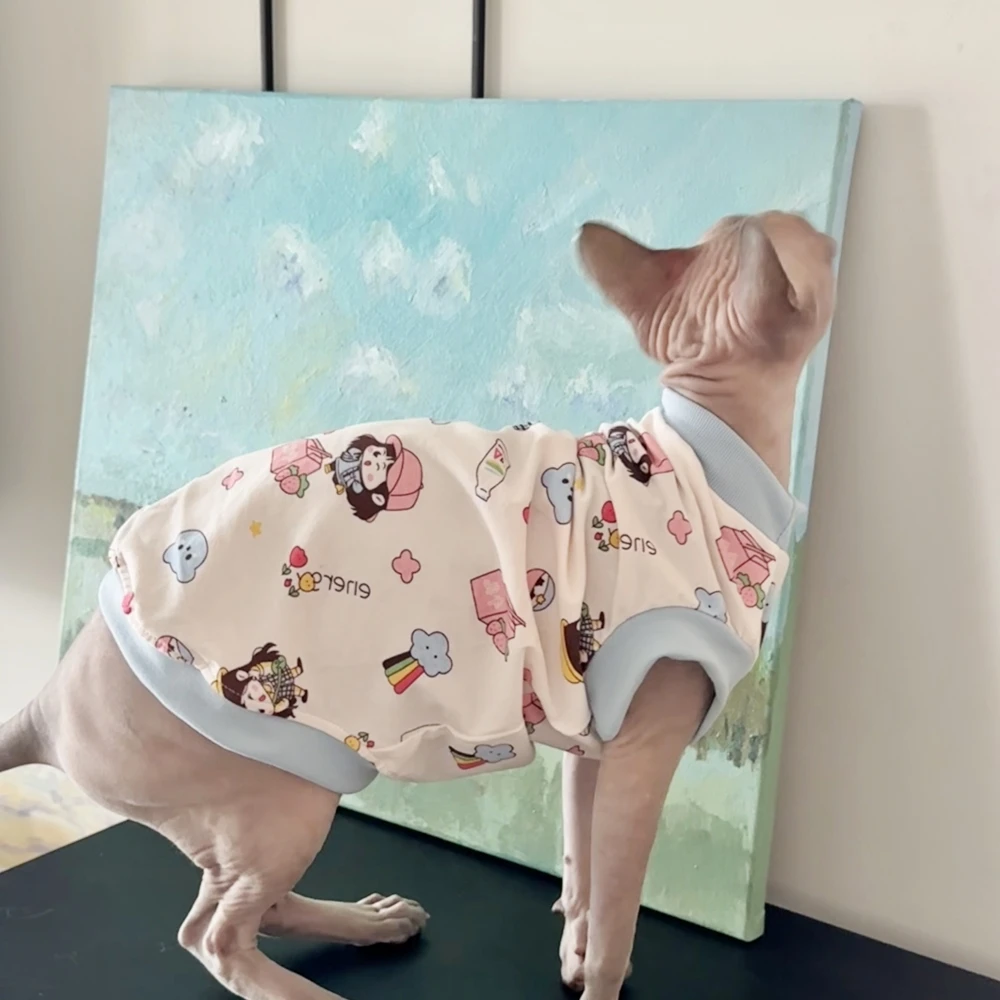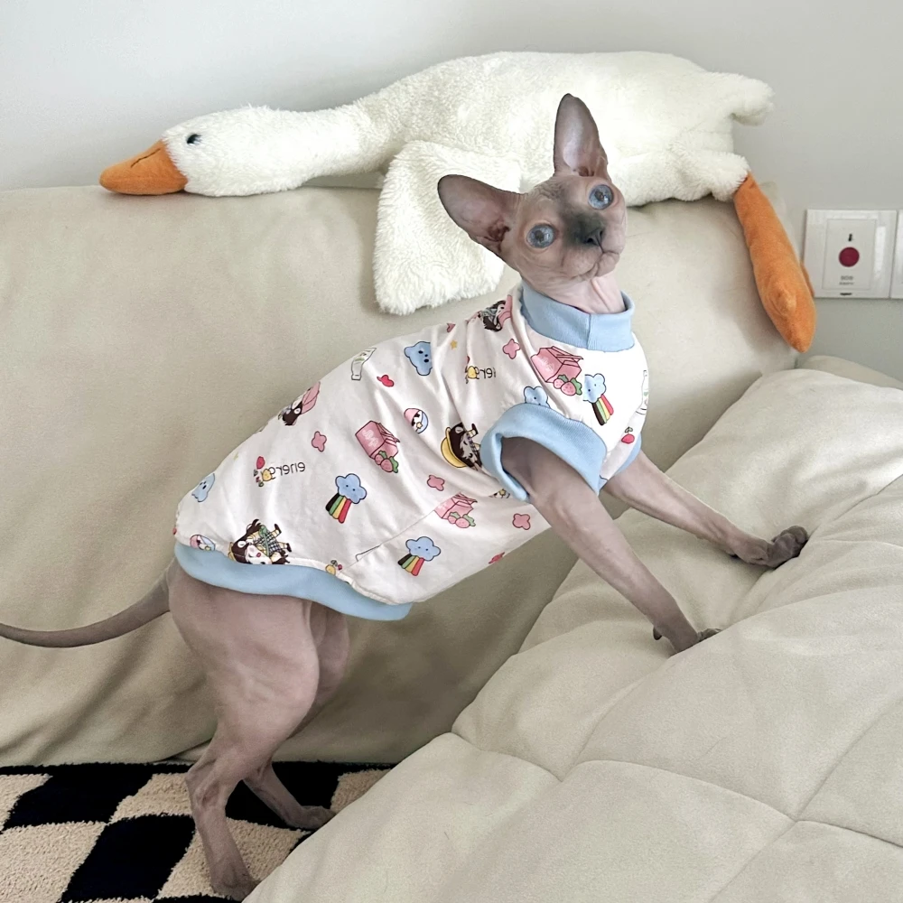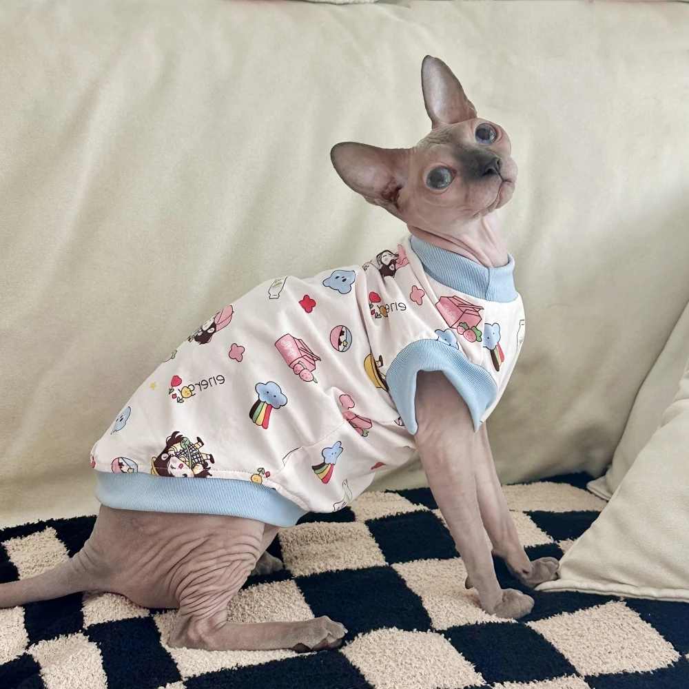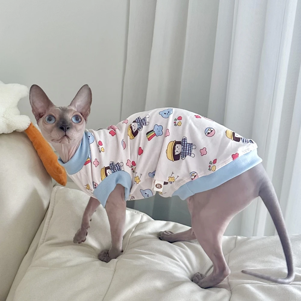 Camiseta de manga corta de algodón suave para perros gato Sphynx en verano lindo abrigo azul pijama de dibujos animados Elestic para gatitos suministros para mascotas