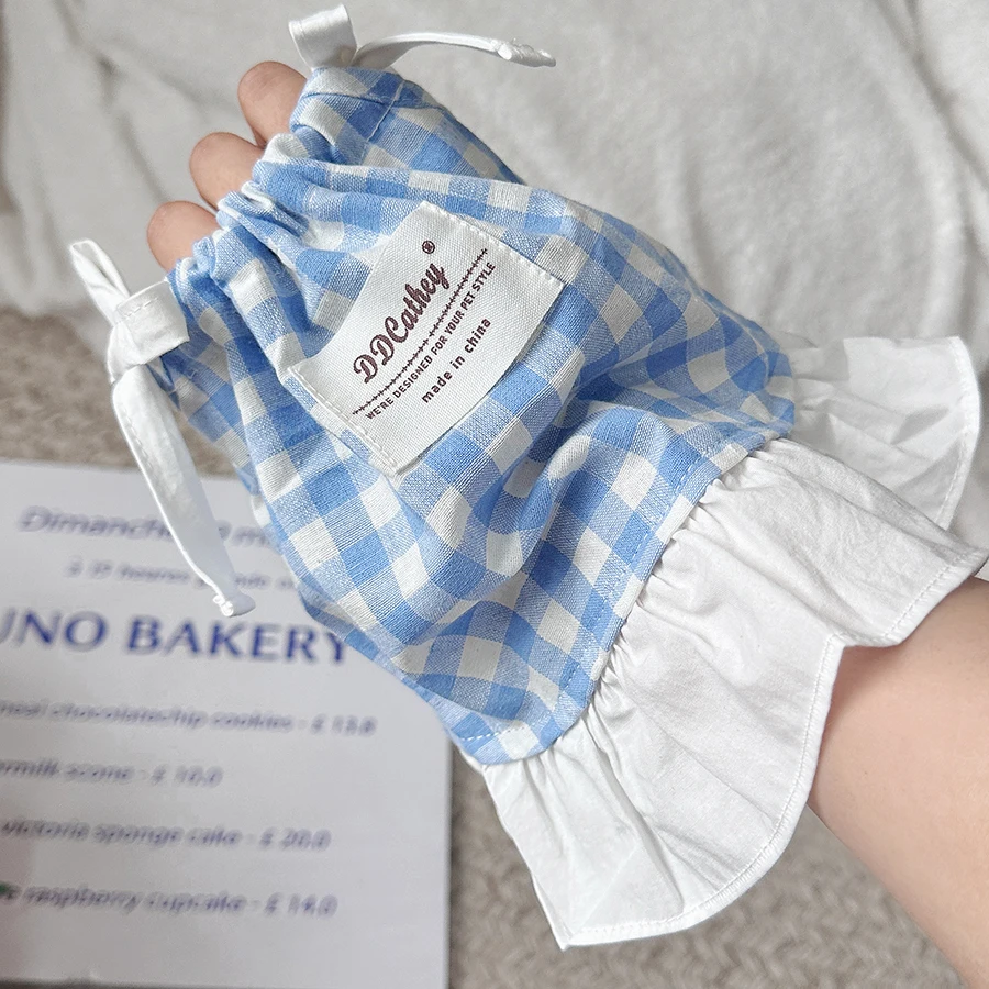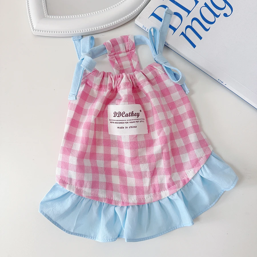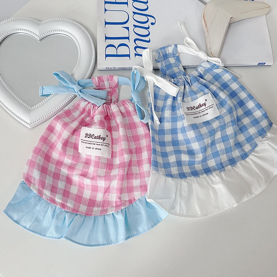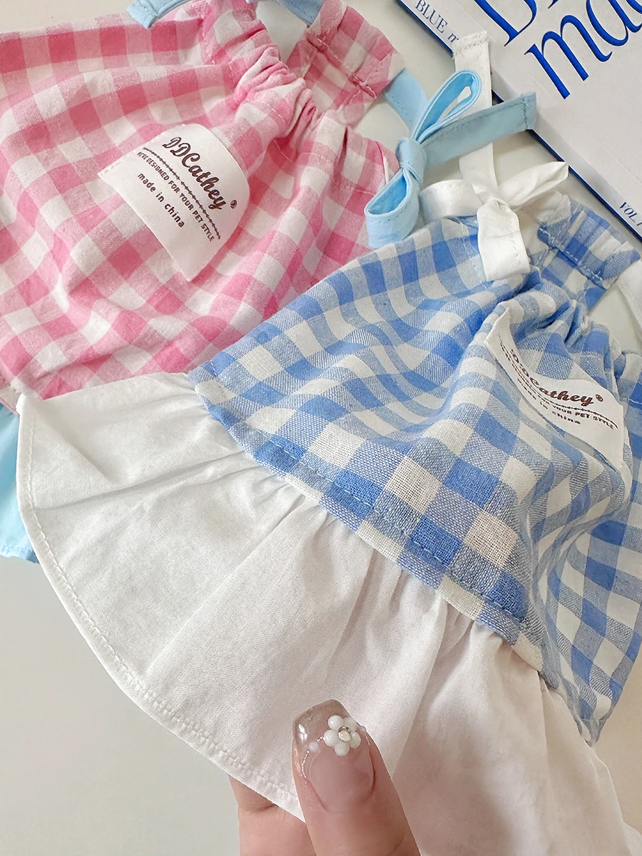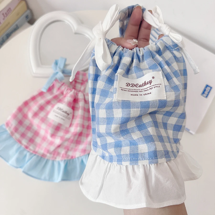 Camiseta sin mangas a cuadros con cordón para mascotas, bonito vestido a cuadros refrescante, Top de encaje con lazo de peluche, vestidos para perros pequeños y cachorros