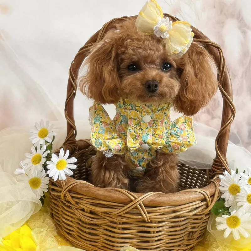 Camiseta sin mangas con mangas voladoras florales para mascotas, vestido con lazo Floral de peluche para perros, ropa para cachorros, vestidos refrescantes para perros pequeños