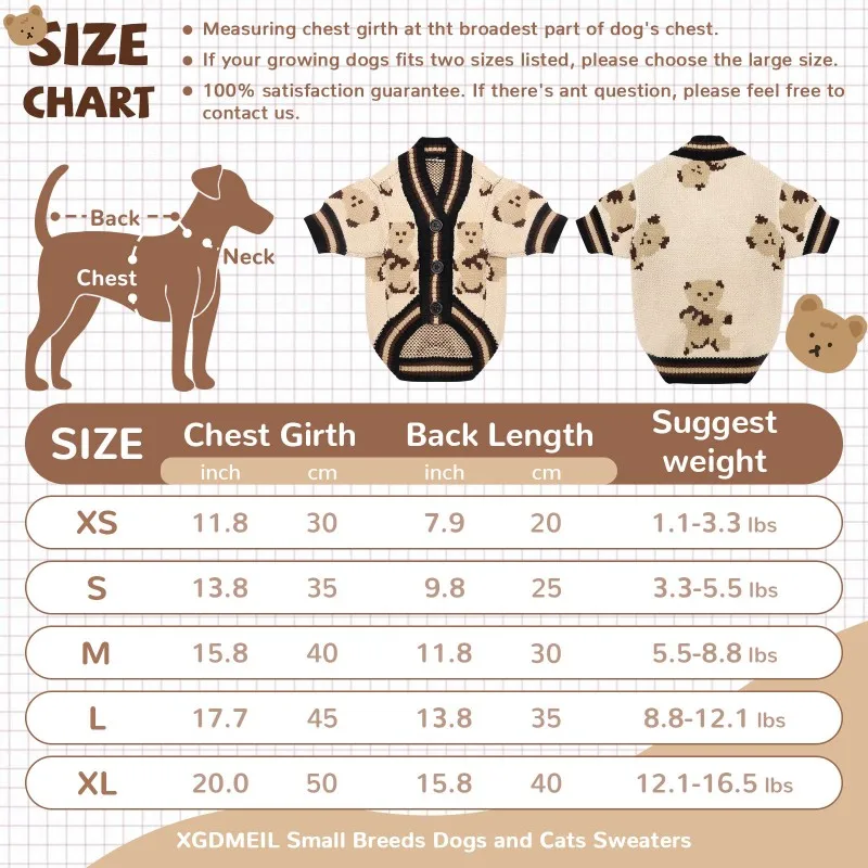 M: Pecho 40cm/15,80''; Longitud 30cm/11,81''; Peso sugerido 2,5-4 kg/5,51-8,82 lbs.
