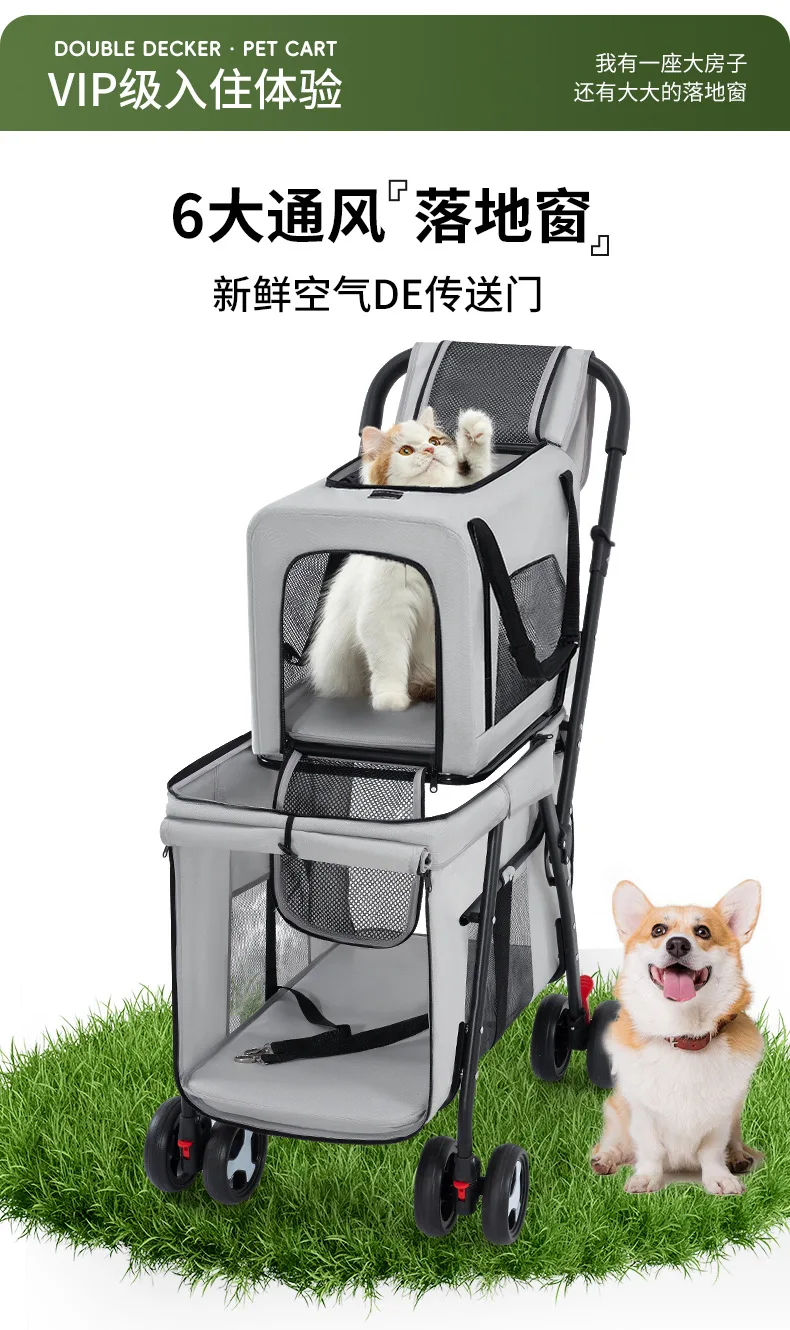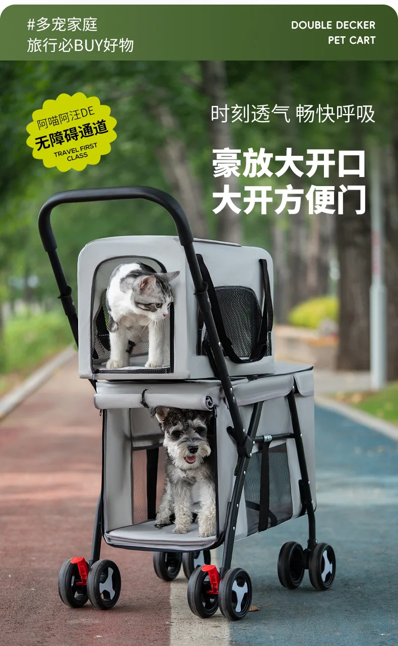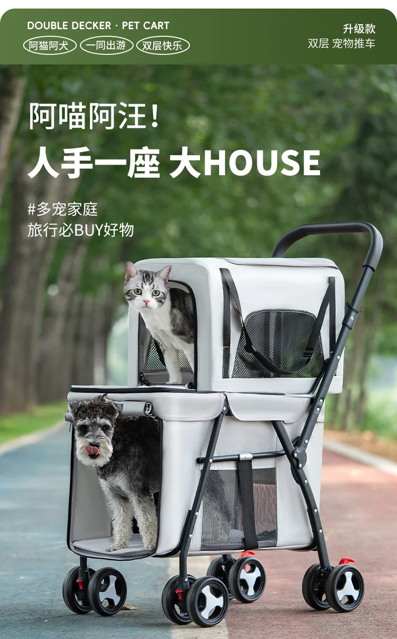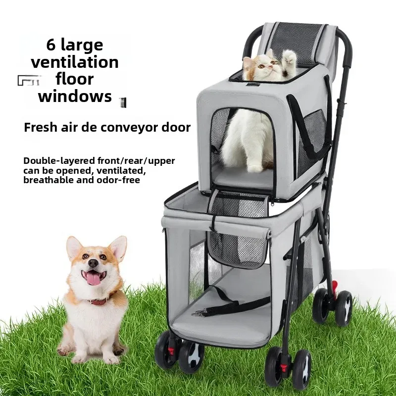 Carro para mascotas de doble capa, carrito para perros y gatos, cochecitos de viaje al aire libre plegables y ligeros