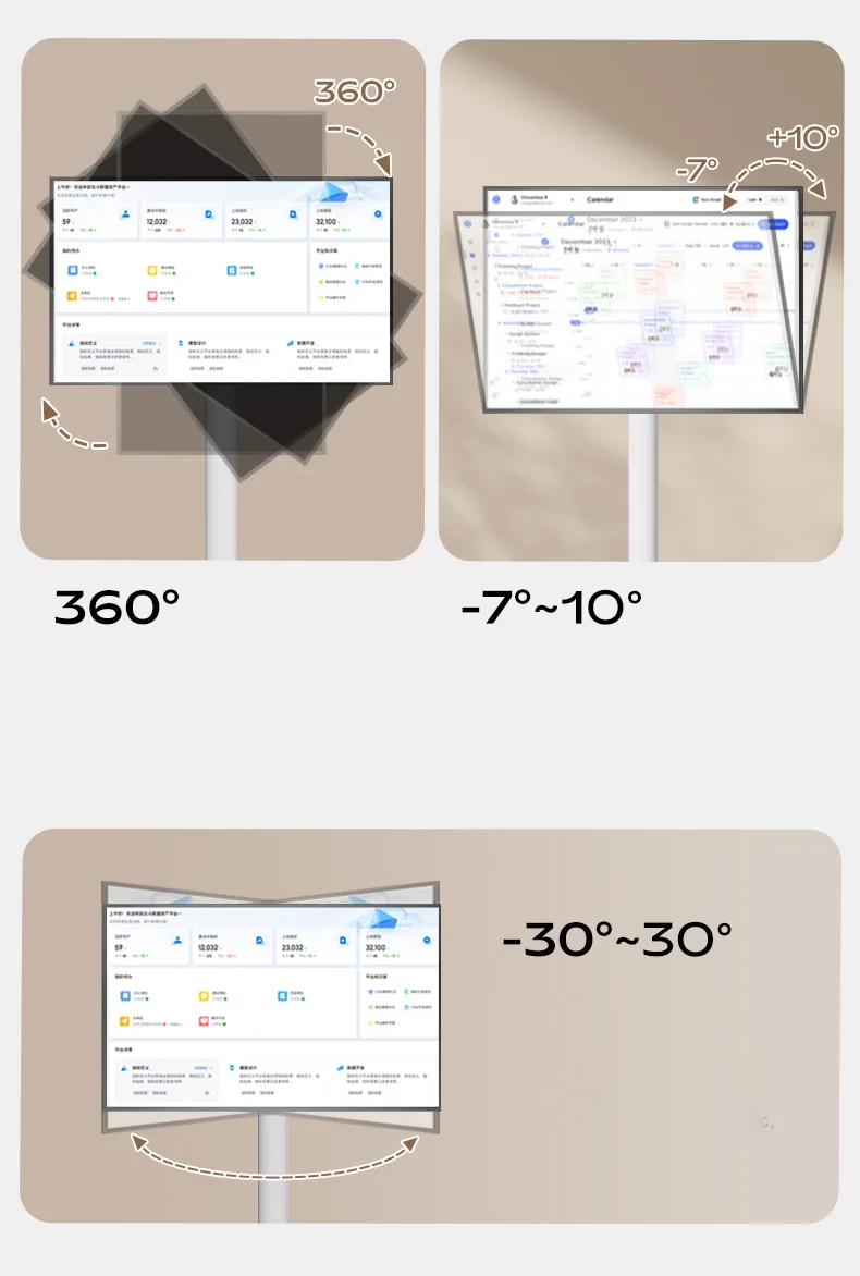 Nivelación:+30~-30 °, Inclinación:-7 *~+10 *, el panel puede girar 360°