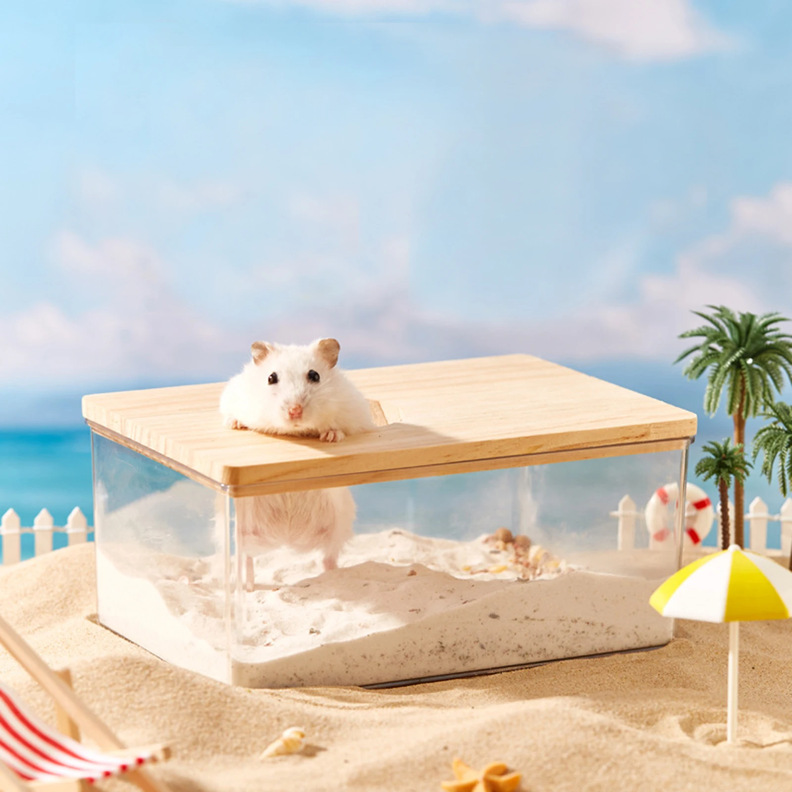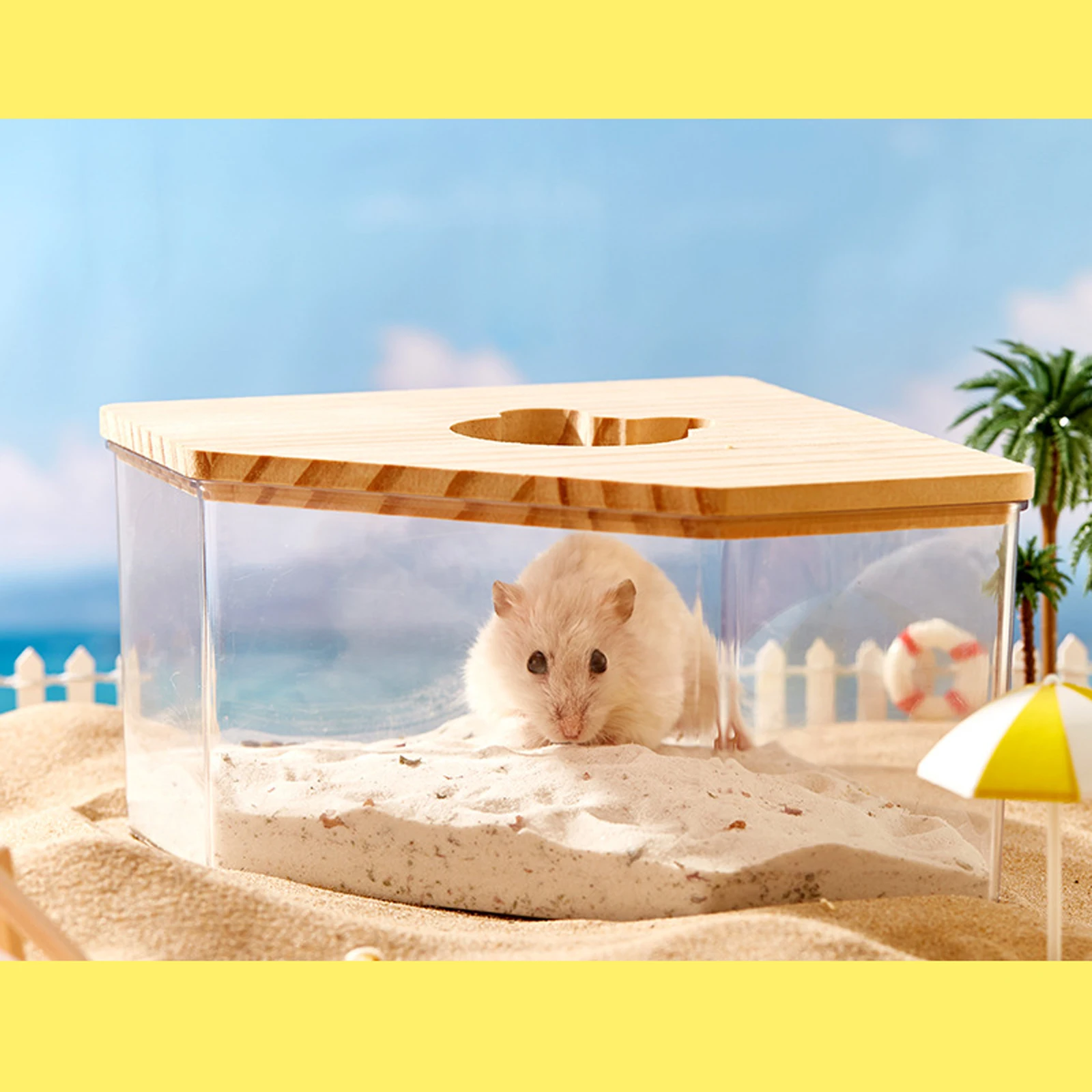 Contenedor de baño de arena para hámster: contenedor de baño transparente para hámster, material acrílico y madera, duradero y fácil de limpiar.