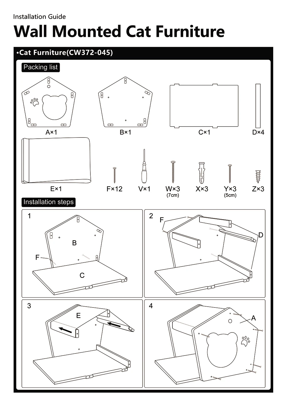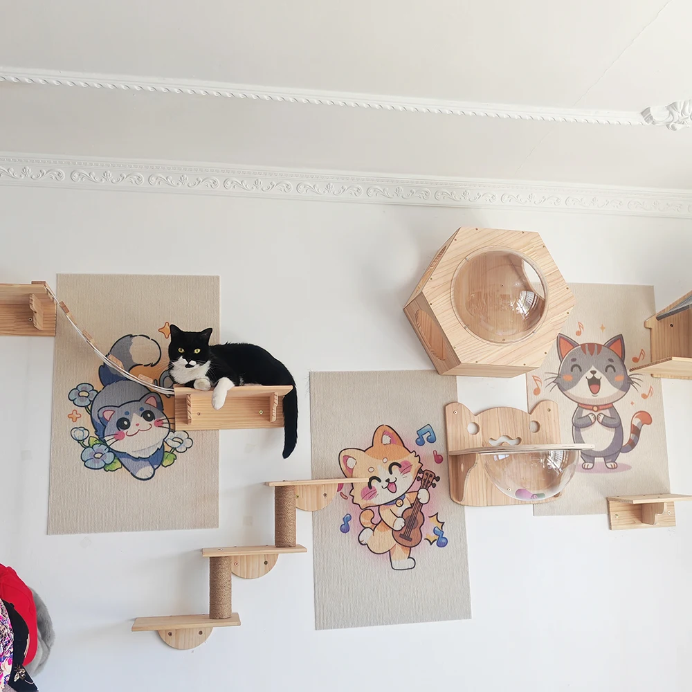 * Juguetes: el dueño puede colocar los juguetes favoritos del gato en la pared del gato y el gato trepará para jugar con el juguete.