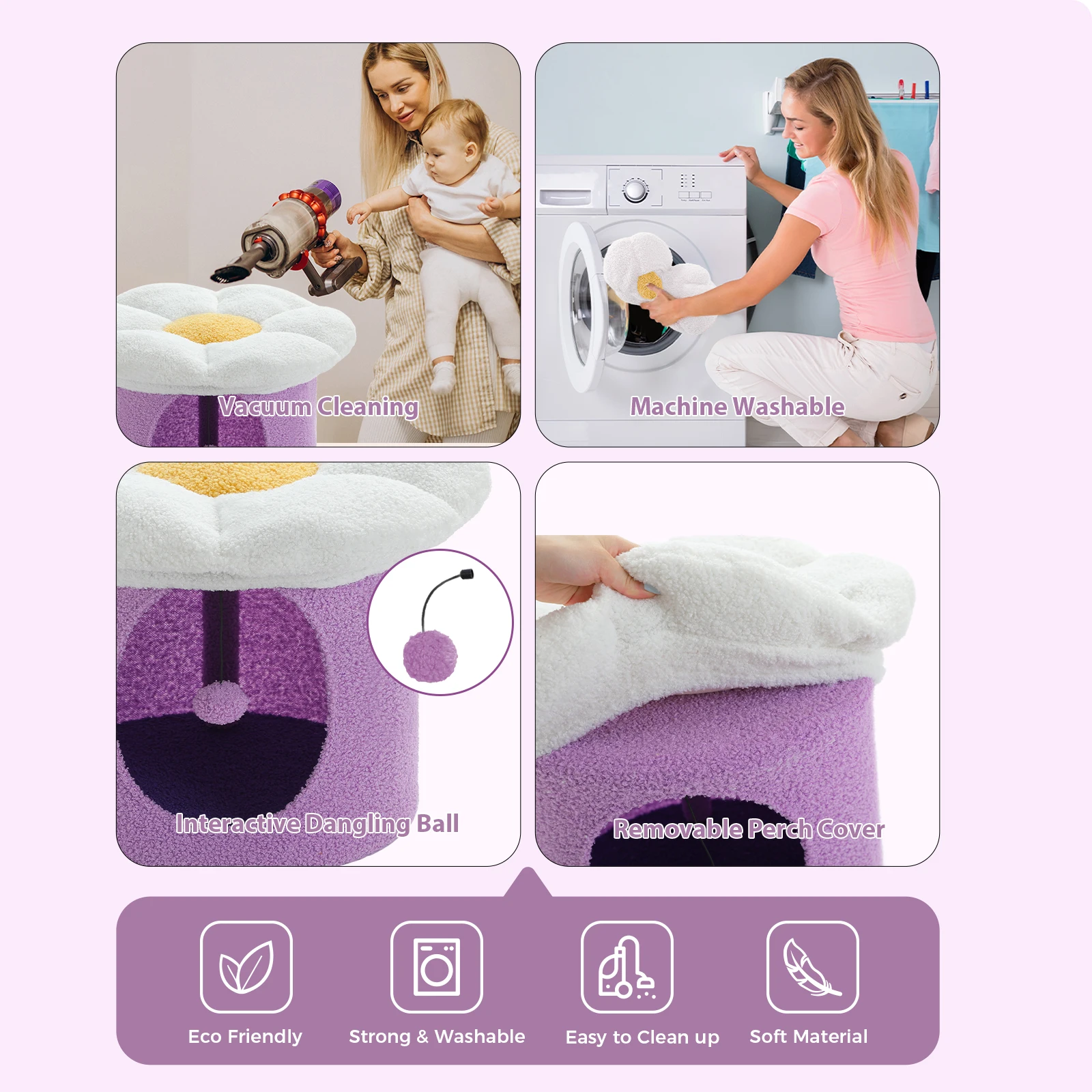 Casa para gatos de flores estable con bola colgante interactiva, percha extraíble, condominio súper grande, zona escondida espaciosa para gatos de interior