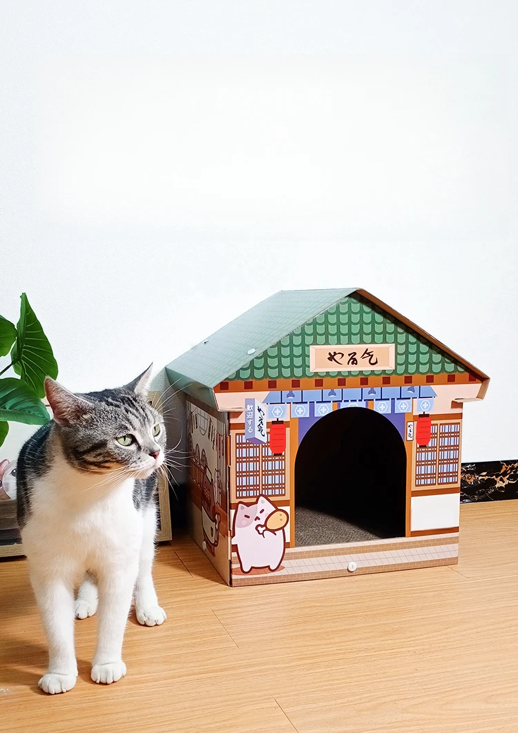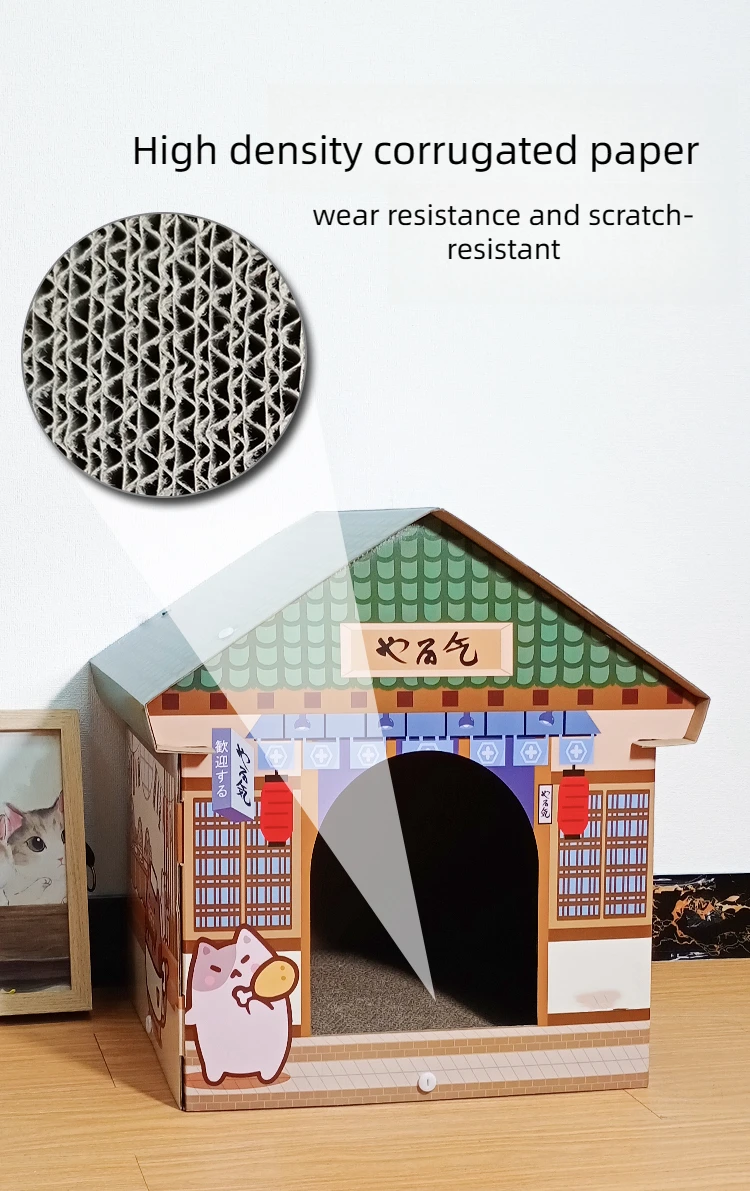 **Material ecológico:** Fabricada con cartón reciclado resistente, nuestra casa para gatos es respetuosa con el medio ambiente y sostenible, lo que la convierte en una opción libre de culpa para los dueños de mascotas concienzios.