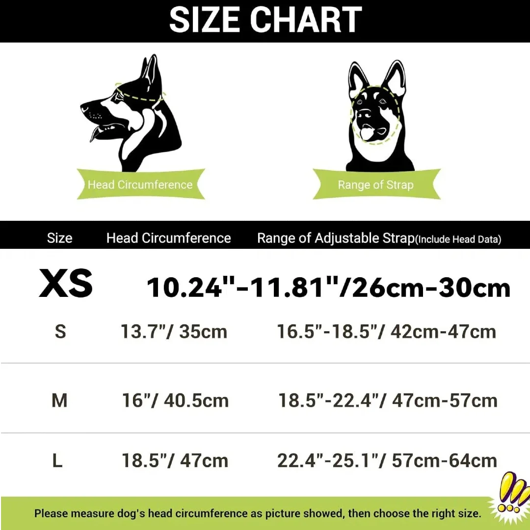 Talla L: circunferencia de la cabeza del casco de aproximadamente 18,5 pulgadas. Rango de correa: 22,5"-25", sugerido para perros de 44-88 libras.Mida la cabeza y la barbilla de su perro antes de comprarlo y elija el tamaño correcto de acuerdo con las instrucciones de tallas.
