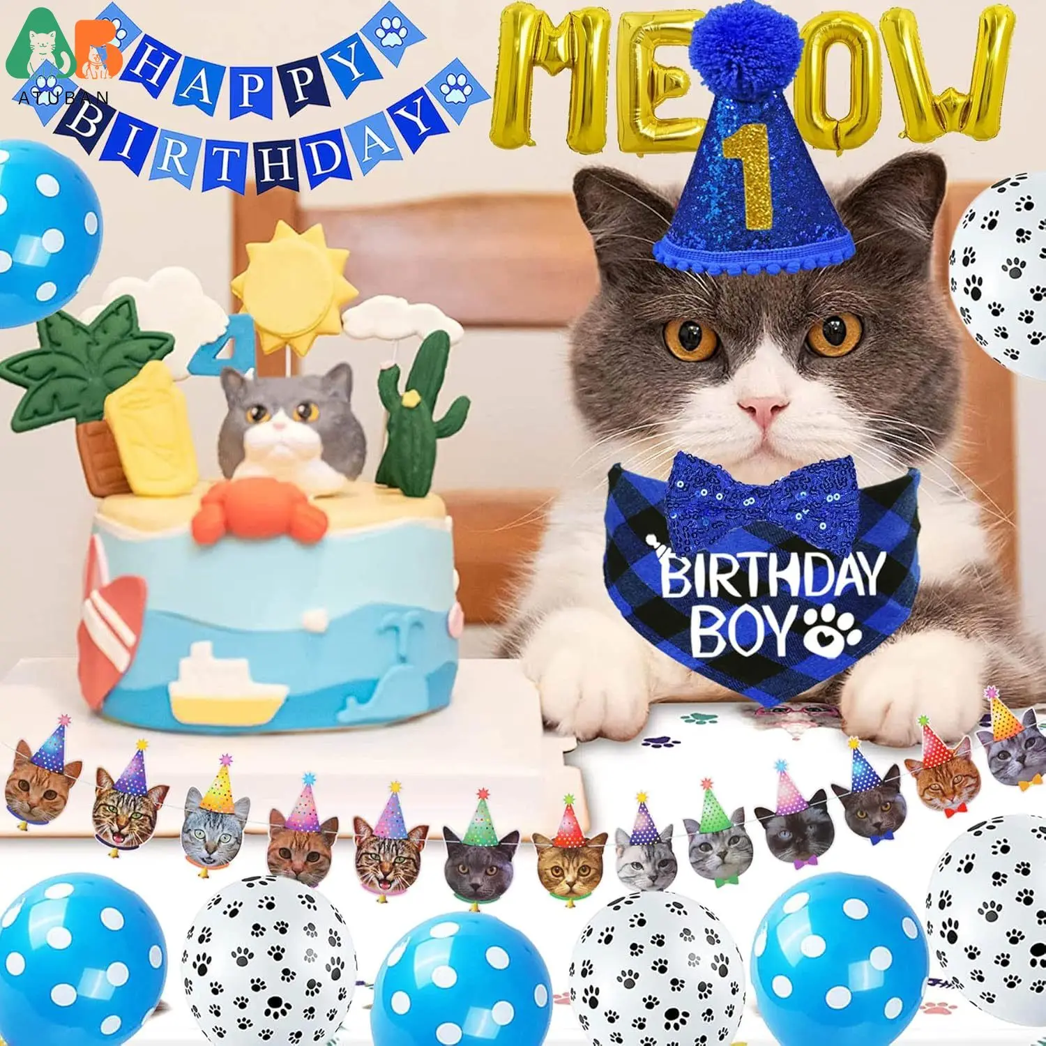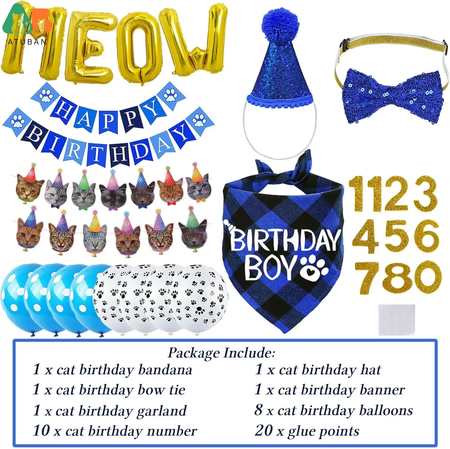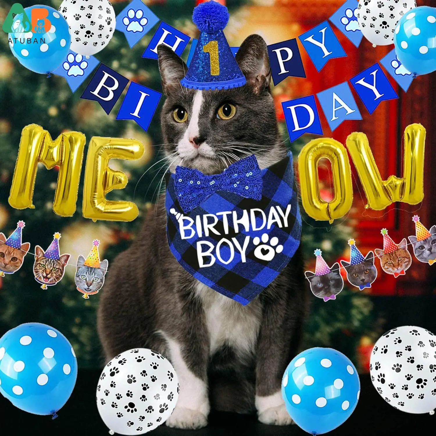 Cat Birthday Party Supplies,Cat Birthday Hat with Cat Birthday Bandana Bow Tie Collar Birthday Number Cat Birthday Decorations