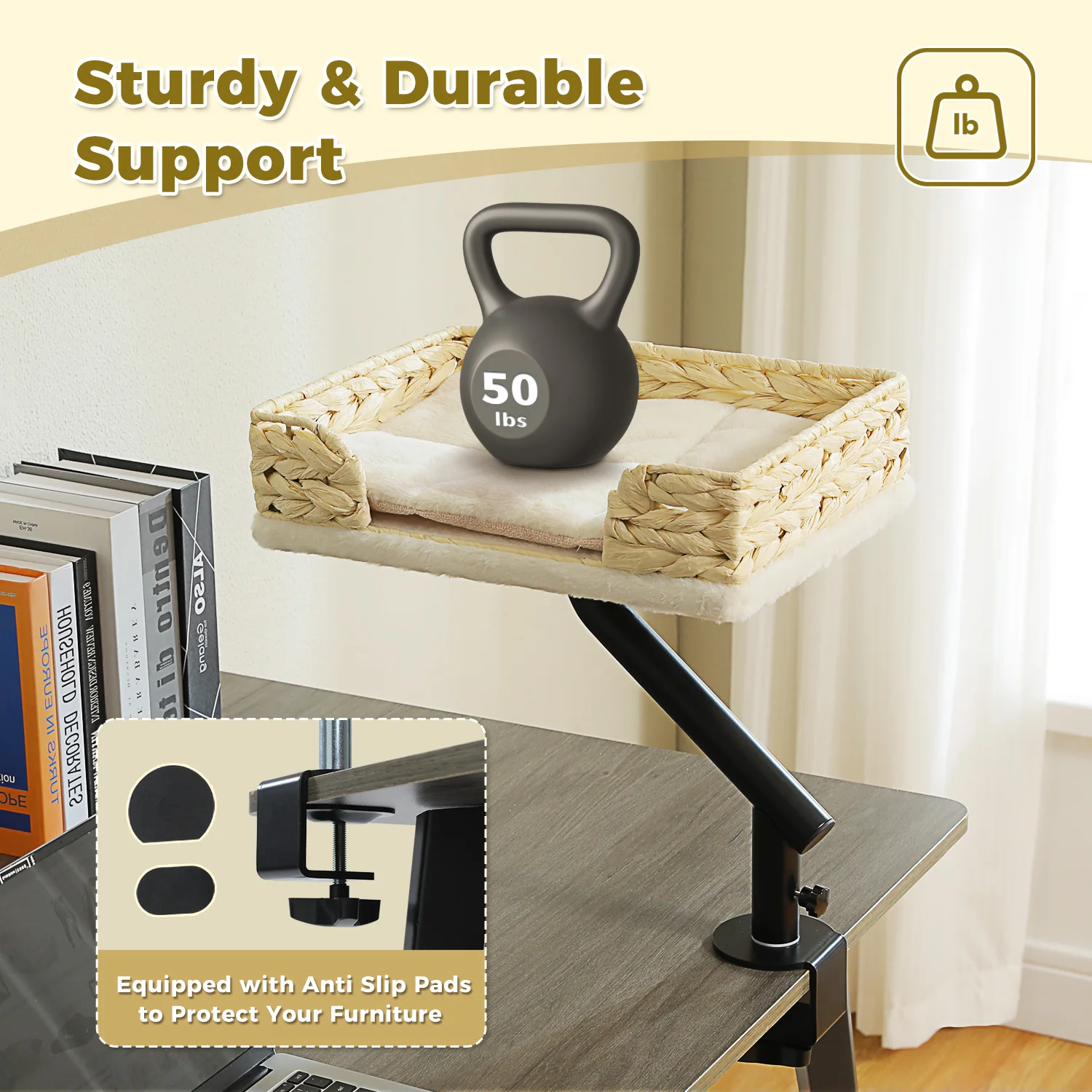 Gato cerca y lugar de trabajo claro:Ideal para espacios de trabajo, esta cama elevada para gatos se monta directamente en su escritorio o mesa, manteniendo a su amigo felino cerca mientras libera valioso espacio en el piso y el escritorio.Perfecto para mantener un ambiente ordenado durante el trabajo o el tiempo libre.
