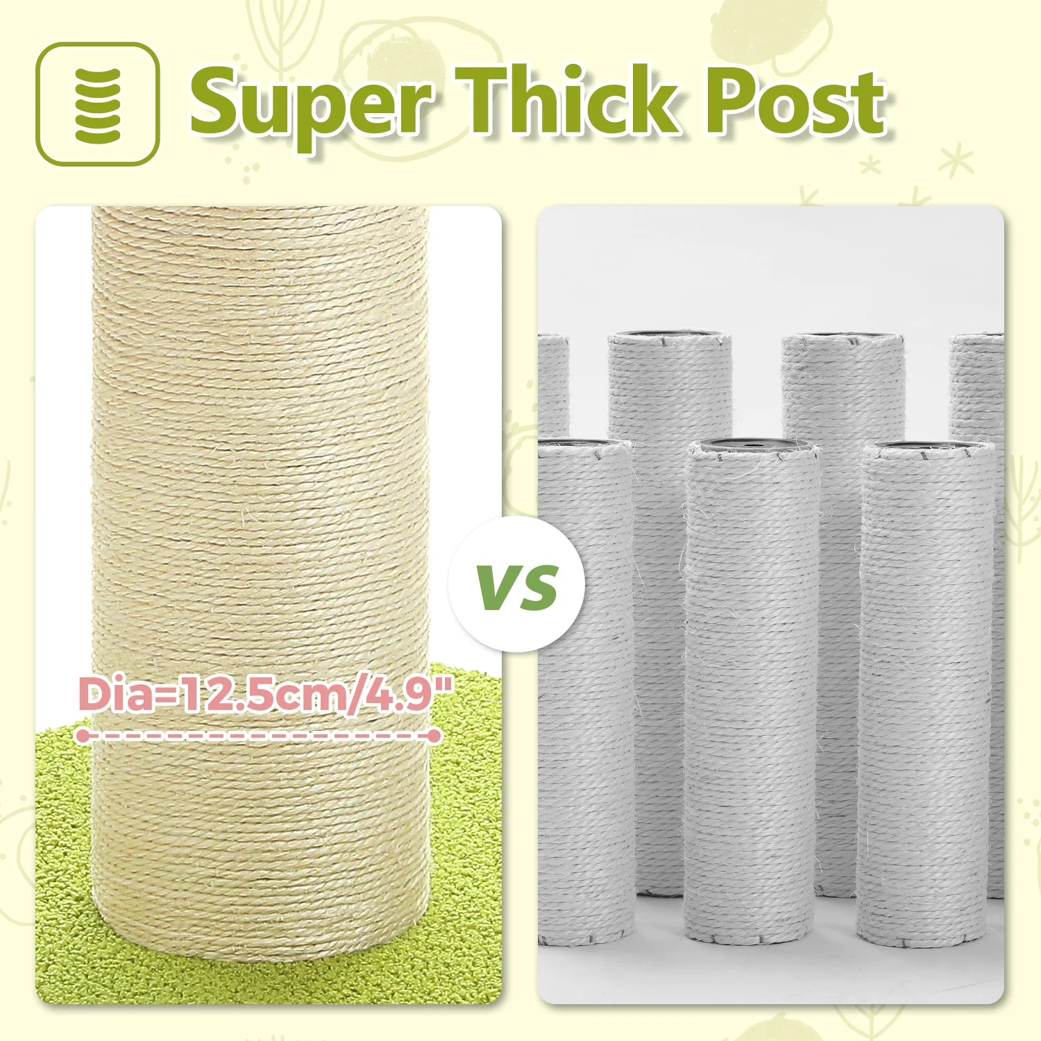 Poste súper grueso: el diámetro del poste cubierto de sisal natural alcanza 4,9 pulgadas que es más grande que casi el 80% del rascador para gatos en el mercado, lo que garantiza un área grande para que sus gatos satisfagan sus necesidades diarias de rascado.Además, este rascador grueso para gatos garantiza la estabilidad de todo el árbol para gatos y mantiene a su bebé alejado de sus costosos muebles de manera eficiente.