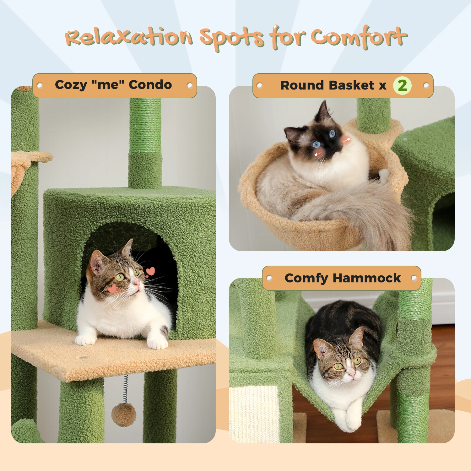 Forma única de cactus: este árbol para gatos con forma de cactus de suelo a techo en verde y amarillo, adecuado para varios gatos, seguramente llamará toda la atención de sus gatos y también combinará perfectamente con su sala de estar.Con 5 plataformas, 3 hamacas y condominio, este árbol para gatos alto multifuncional ofrece a sus bebés peludos suficiente lugar de recreación.
