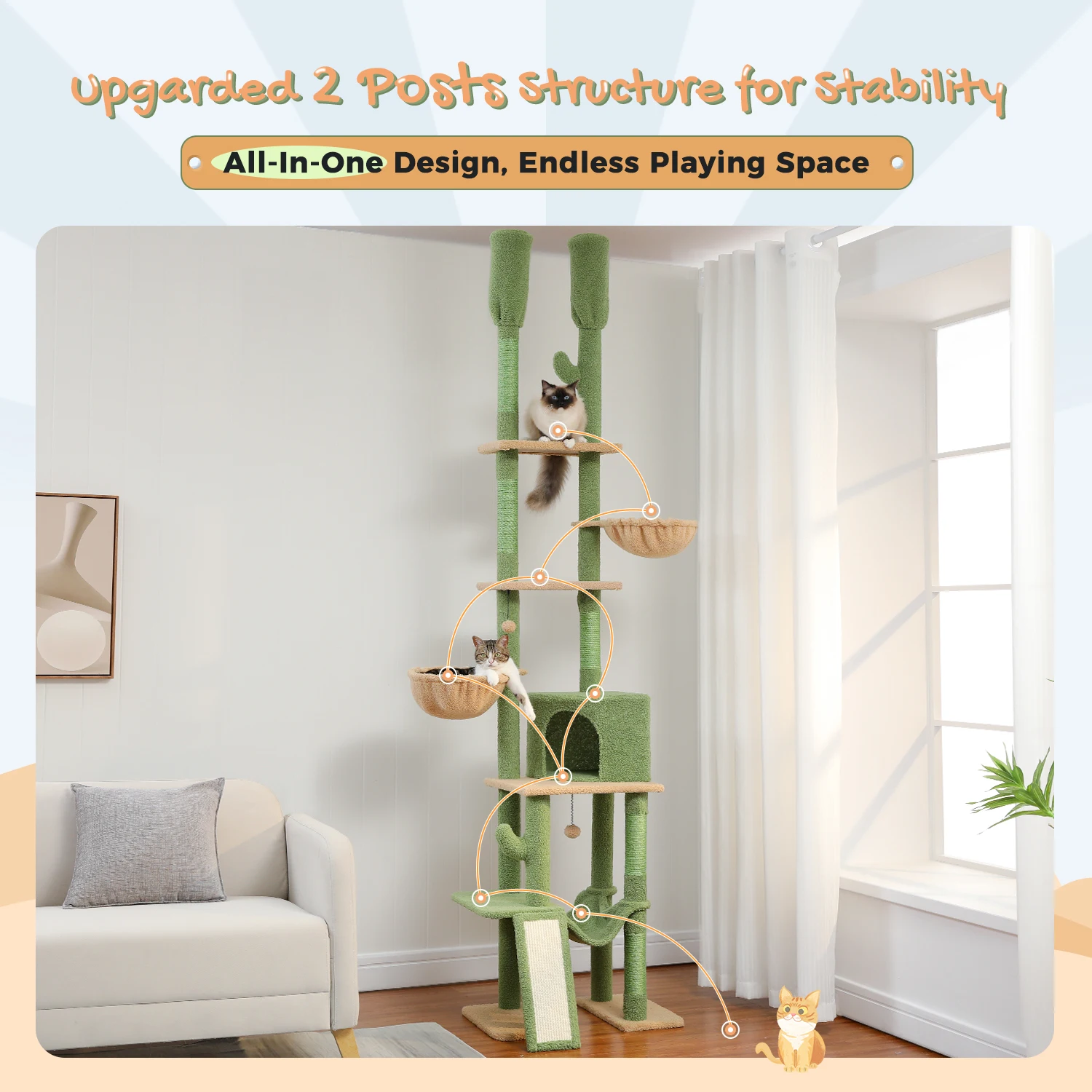 Árbol para gatos de Cactus, piso hasta techo, torre para gatos, árbol trepador de 7 niveles con acogedoras hamacas y condominios, 5 plataformas, postes rascadores