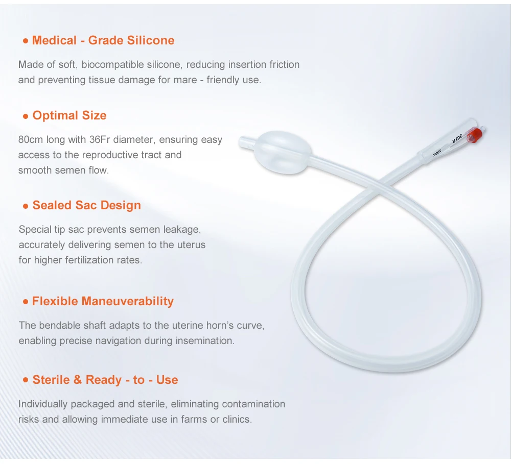 2. Tamaño óptimo:80 cm de largo con 36 Fr de diámetro, lo que garantiza un fácil acceso al tracto reproductivo y un flujo suave de semen.