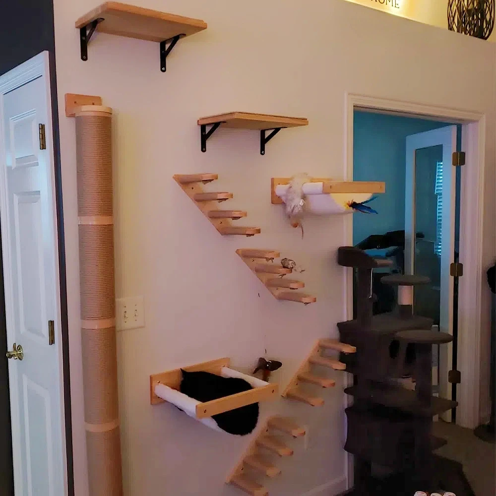 Los estantes de pared para gatos se adaptan al hábito de los gatos de escalar, aumentan el ejercicio y reduciendo la posibilidad de obesidad, lo que es bueno para la salud.Además, le da a los gatos espacio para escalar y evitar estropear la casa.
