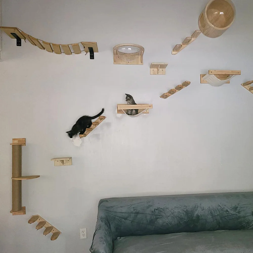 Los estantes de pared para gatos se adaptan al hábito de los gatos de escalar, aumentan el ejercicio y reduciendo la posibilidad de obesidad, lo que es bueno para la salud.Además, le da a los gatos espacio para escalar y evitar estropear la casa.