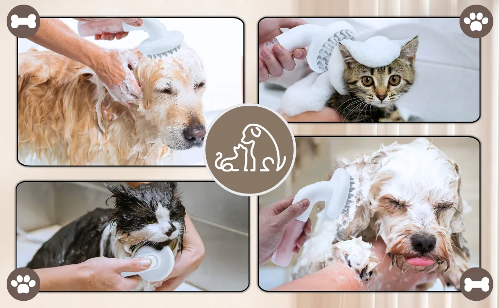 El cabezal del cepillo está diseñado con silicona suave. Cada cabezal de cepillo tiene 5 partículas de masaje. Después de bañar a tu mascota, puedes masajearla y peinarla. Puede resolver eficazmente los problemas de baño, depilación, masaje y aseo de su mascota. Haga que a las mascotas les guste la sensación de bañarse y disfrutar de la hora del baño.