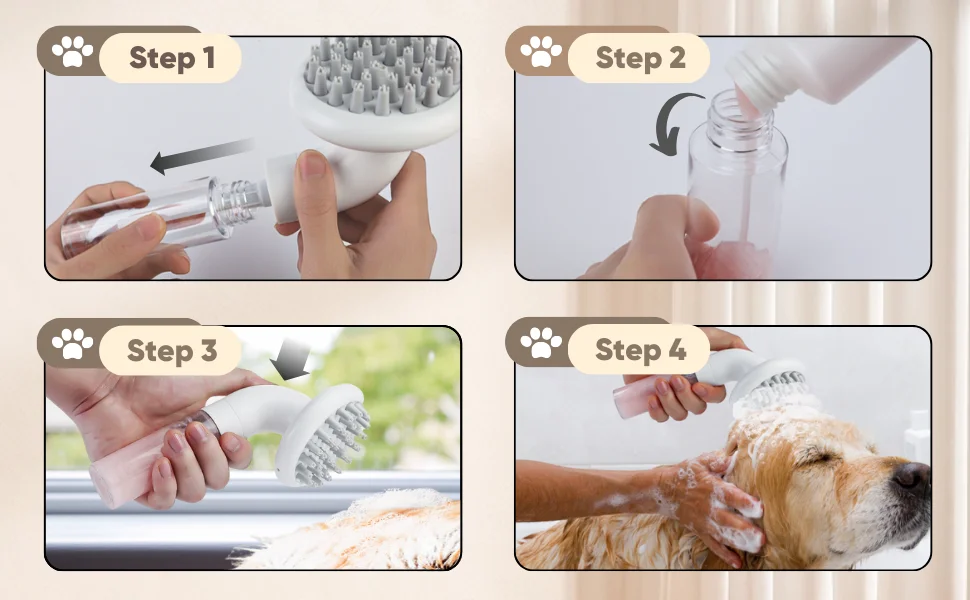 Este cepillo de baño para perros está diseñado para el baño, el aseo y el masaje. Simplemente Llene la botella con gel de ducha y puede usarlo en cualquier momento durante el baño de su mascota. También se puede utilizar como cepillo de masaje para masajear y peinar el pelo de su mascota.