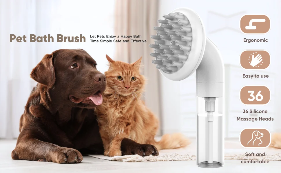 El cepillo de baño para perros adopta un diseño ergonómico. El puerto de presión está diseñado para imitar el pulgar y tiene una función antideslizante. Puede exprimir fácil y rápidamente el gel de ducha. El cabezal del cepillo tiene un cierto ángulo de inclinación, lo que puede hacer un mejor contacto con el cuerpo de la mascota, haciendo que la limpieza esté más en su lugar.