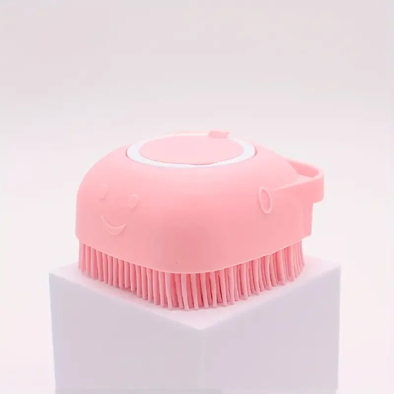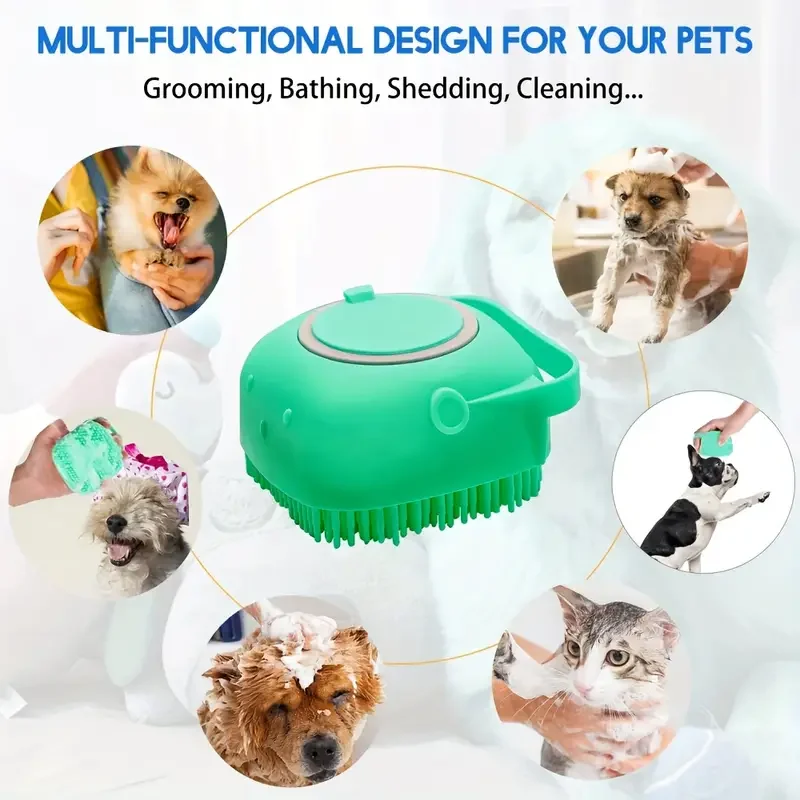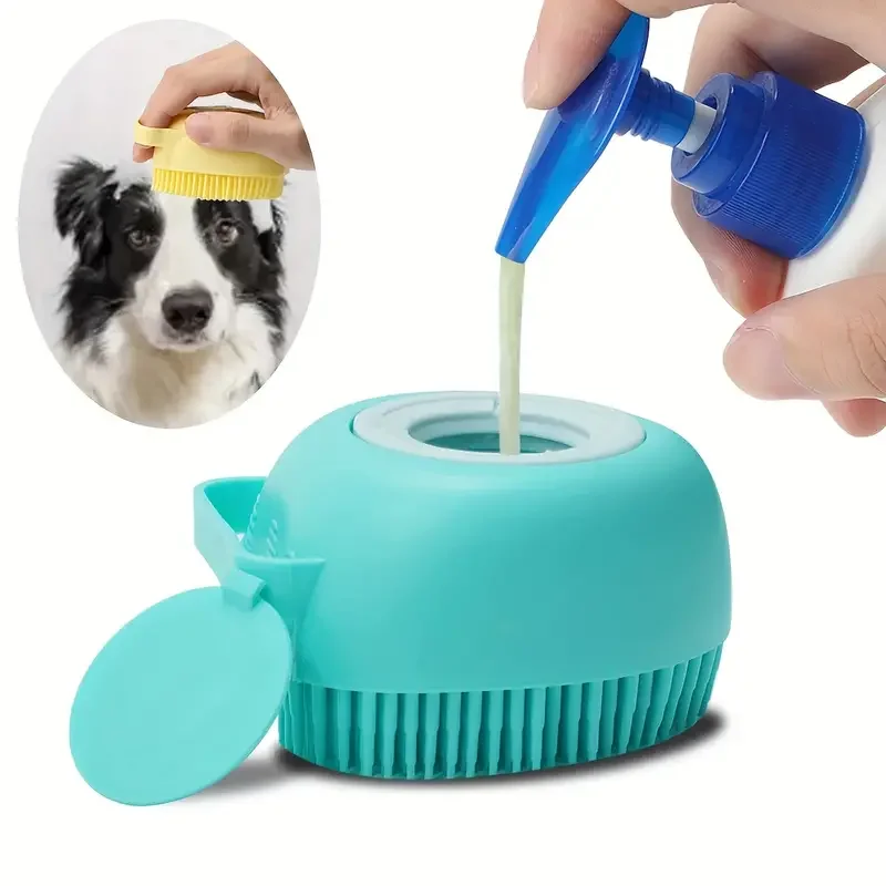 Cepillo de champú para mascotas, peine de baño de goma para masaje de silicona con almacenamiento de champú para herramienta de aseo para perros y gatos