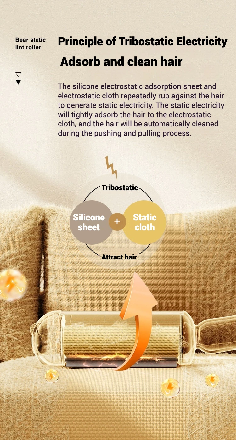 🌟 2. Electrostatic Cleaning Technology: Uses friction and static electricity to attract and collect pet hair. Silicone static panels and static cloth create a powerful charge during brushing, which traps hair onto the static cloth for effortless cleaning.