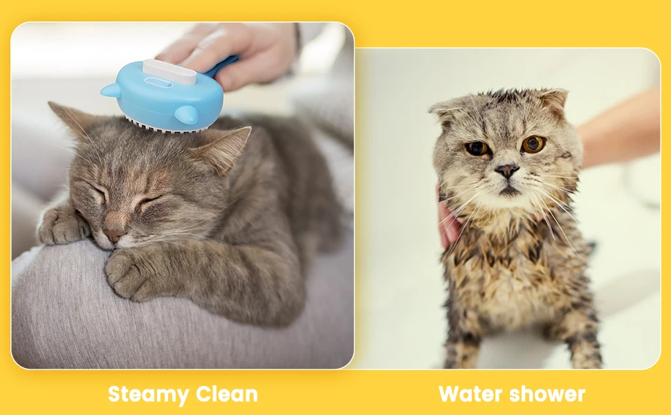 Cepillo de vapor antiestático para mascotas: el cepillo de vapor para mascotas tiene vapor fino que puede humedecer el cabello y reducir la generación de electricidad estática, también puede agregar un limpiador de mascotas al cepillo de pelo de gato para limpiar a su gato en lugar de ducharse a su gato.