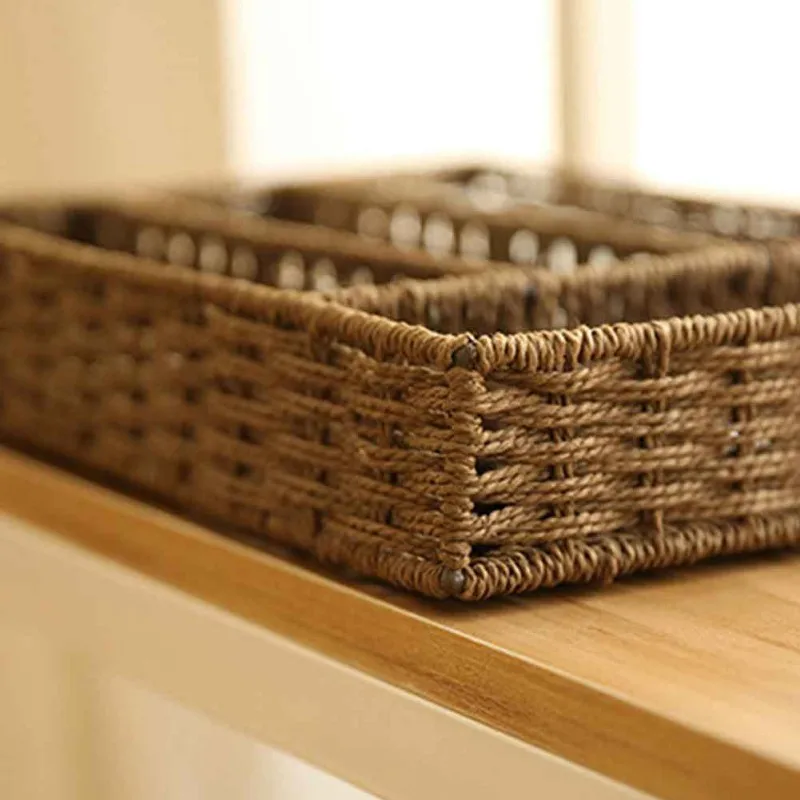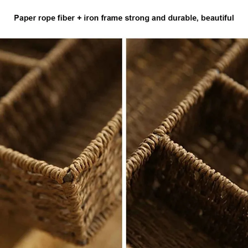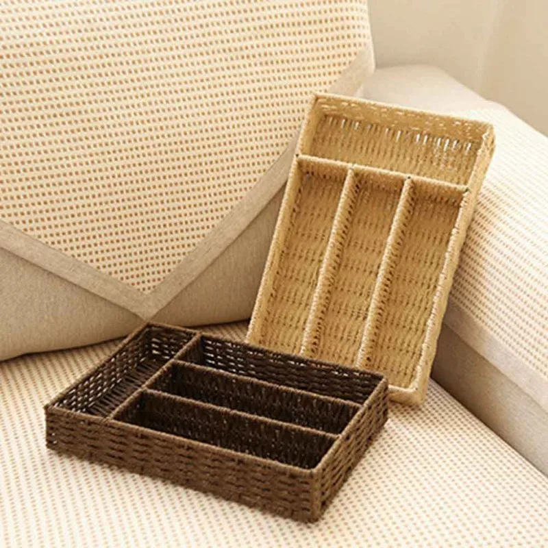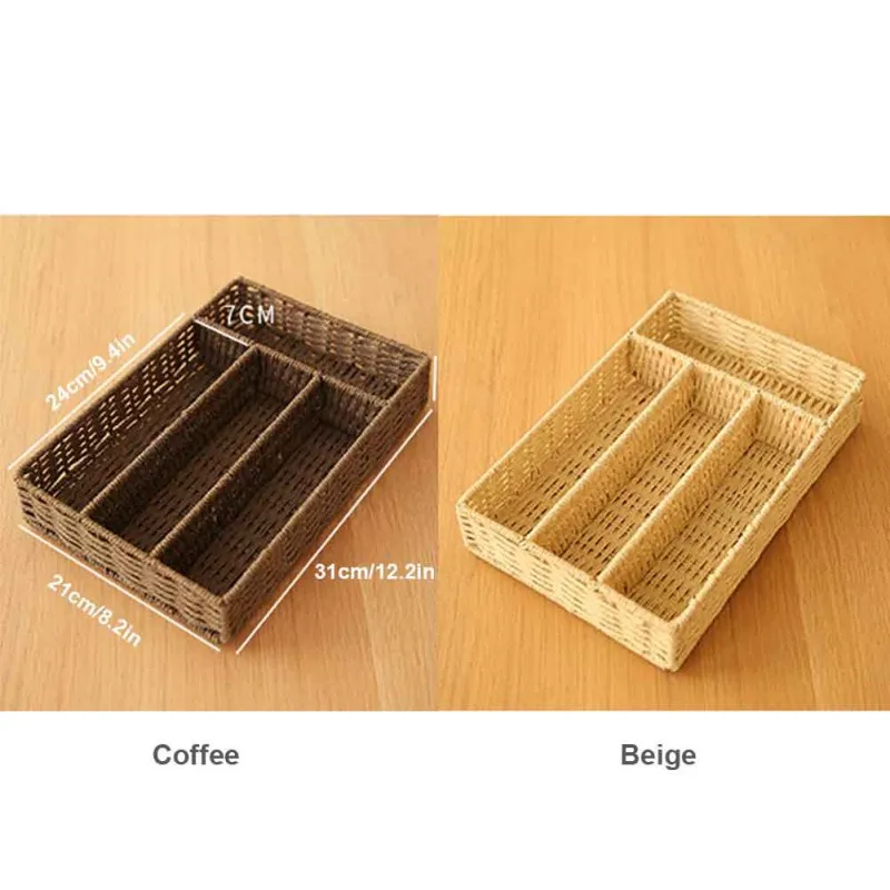 1. Material de alta calidad: hecho de plástico de mimbre de imitación de alta calidad, bandeja pequeña para baño de oficina: sin pintura, cero formaldehído. Resiste todo tipo de clima, no se romperá ni se desmoronará, suave y duradero. Los cuatro compartimentos de montaje le permiten organizar sus pertenencias ordenadamente. Son tres rejillas de almacenamiento largas de 24*7*5cm y una rejilla de almacenamiento larga de 21*7*5cm.