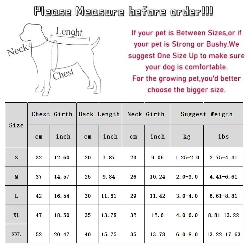 XXL circunferencia del pecho 52 cm/20,47 pulgadas; longitud de la espalda 40 cm/15,75 pulgadas; circunferencia del cuello 35 cm/13,78 pulgadas; Peso sugerido 6,0-8.0 kg/13,22-17,63 libras