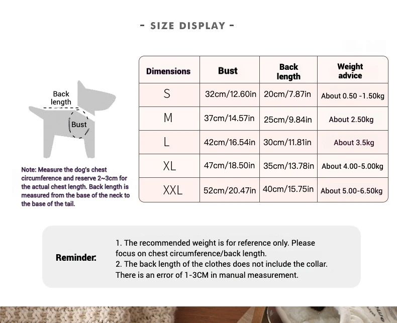 · XXL: 52 cm/20,47 pulgadas (busto), 40 cm/15,75 pulgadas (longitud trasera), aproximadamente 5,00-6,50 kg (consesoramiento de peso)