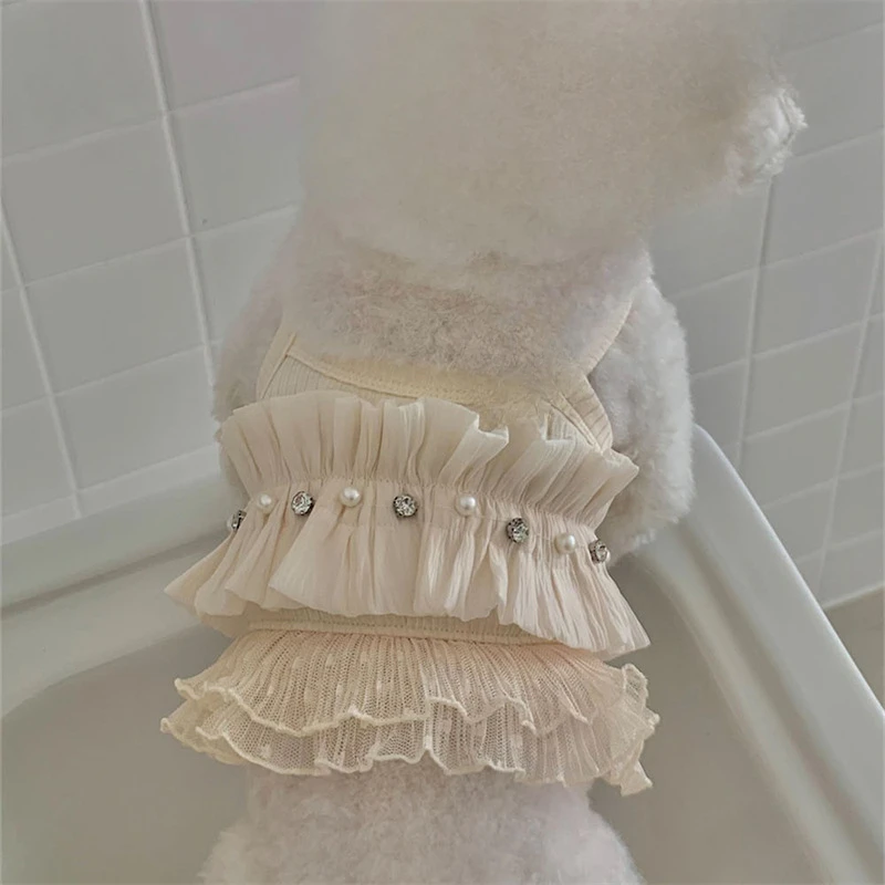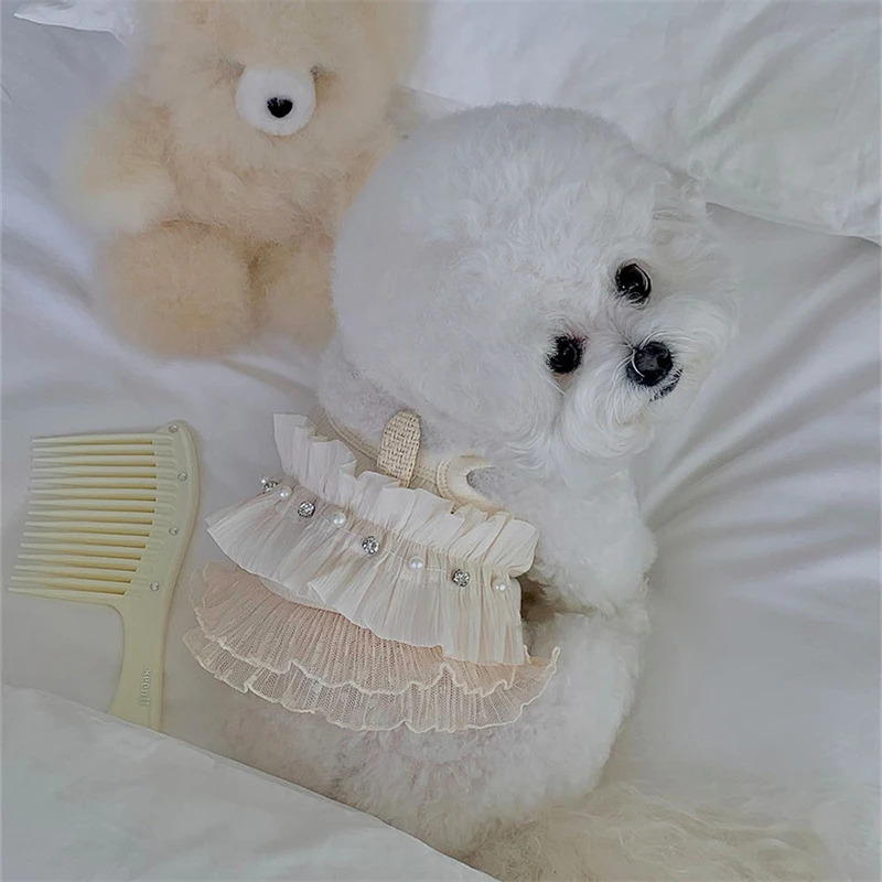 Chaleco de encaje para mascotas para primavera, vestido de princesa de malla plisado para gato, vestido de boda, bonito tocado con lazo, camisa para perro, ropa para cachorros