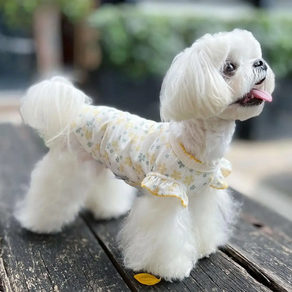 Lo que la camisa para mascotas puede ofrecerle es que es suave y elástica, y el perro no se siente apretado cuando la usa. Hace que el perro se vea más elegante y atractivo debido al elegante diseño de la manga voladora y el delicado diseño del dobladillo.