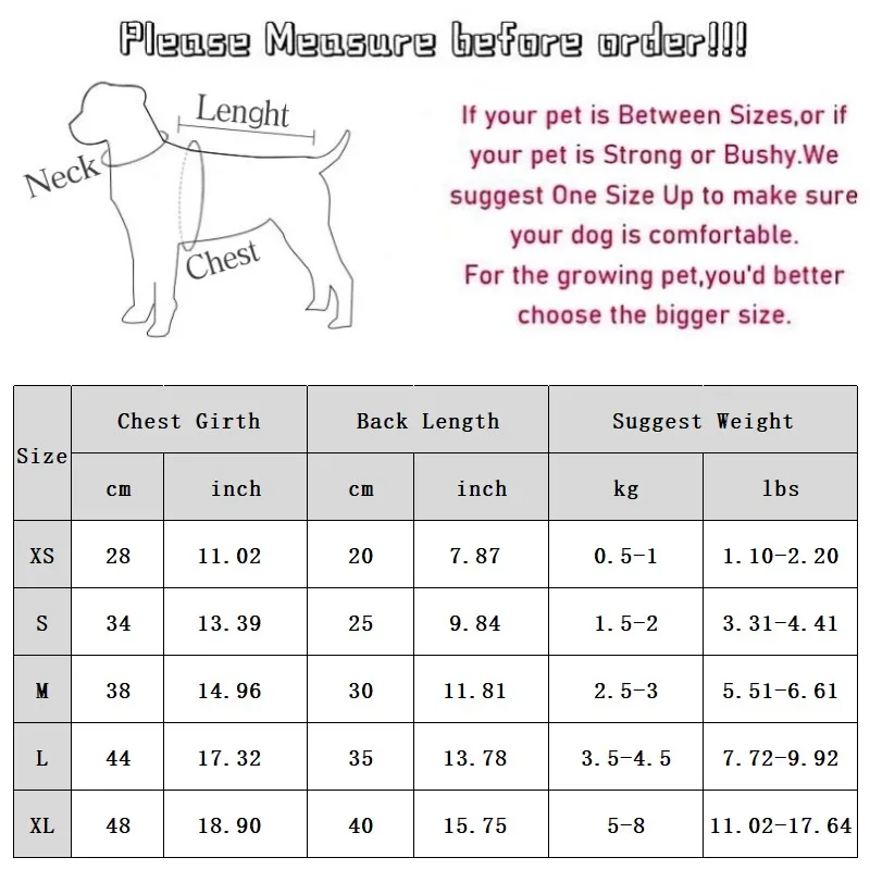 XL: pecho 48cm/18,90 ''; longitud 40cm/15,75''; peso recomendado 5,0-8,0 kg/11,02-17,64 lbs.