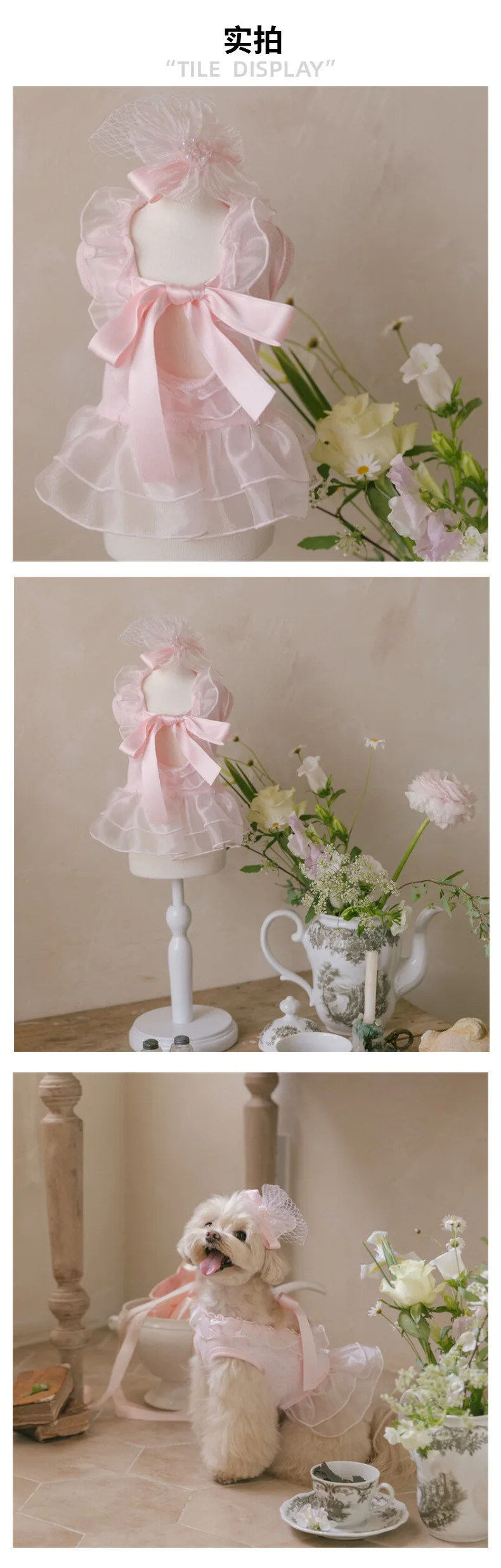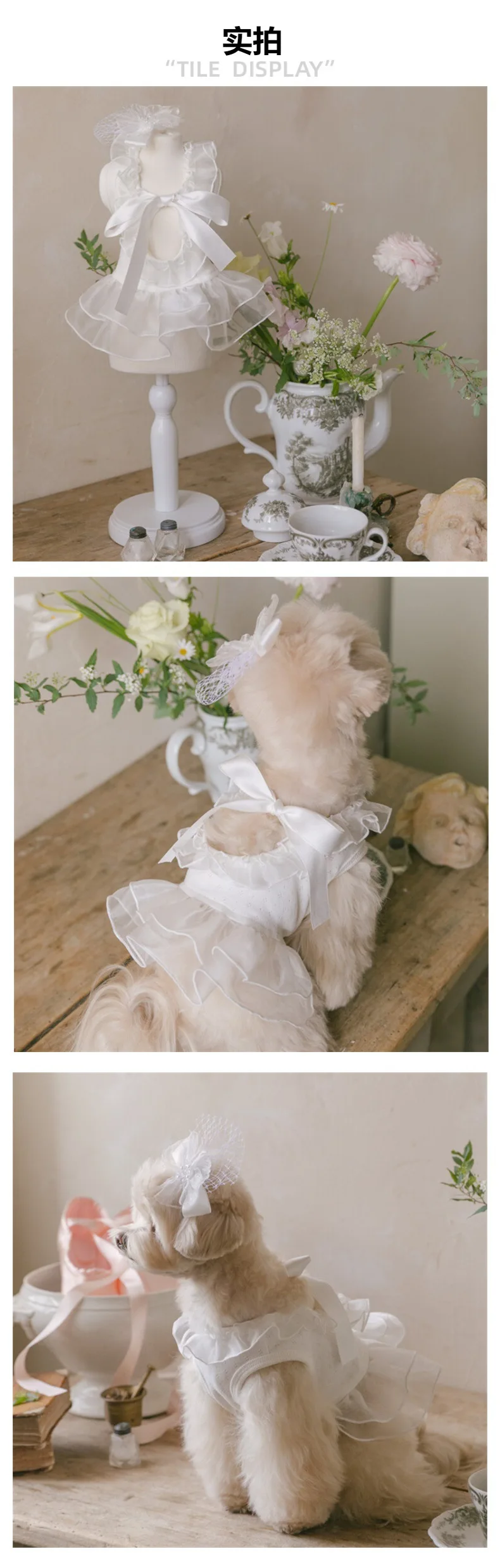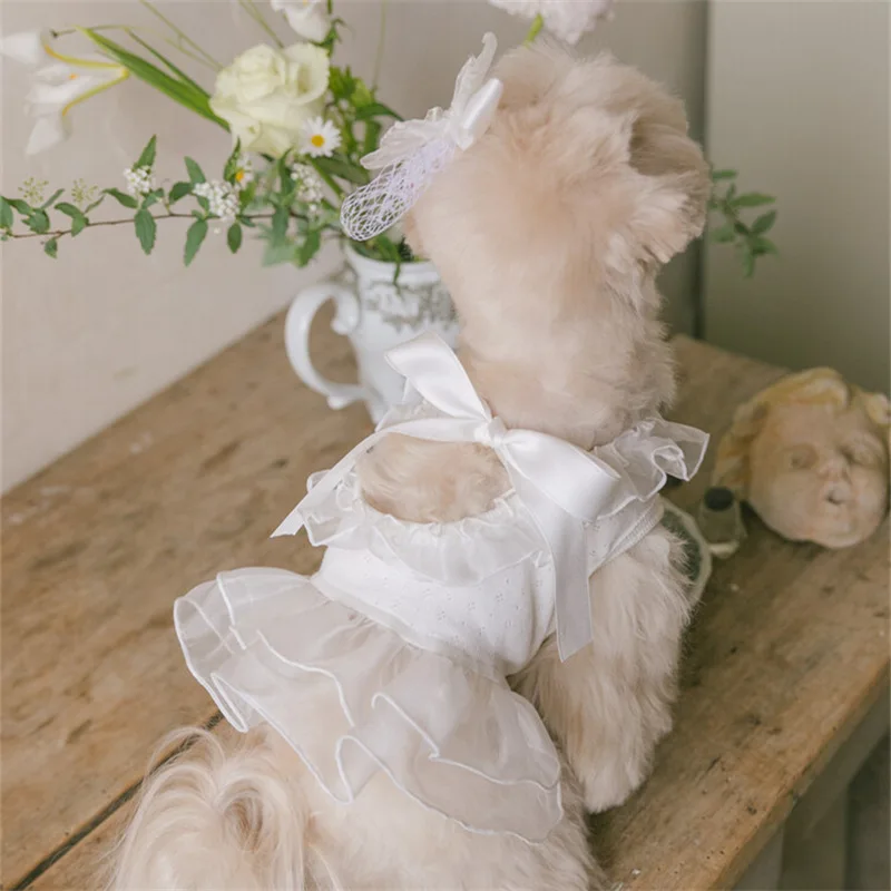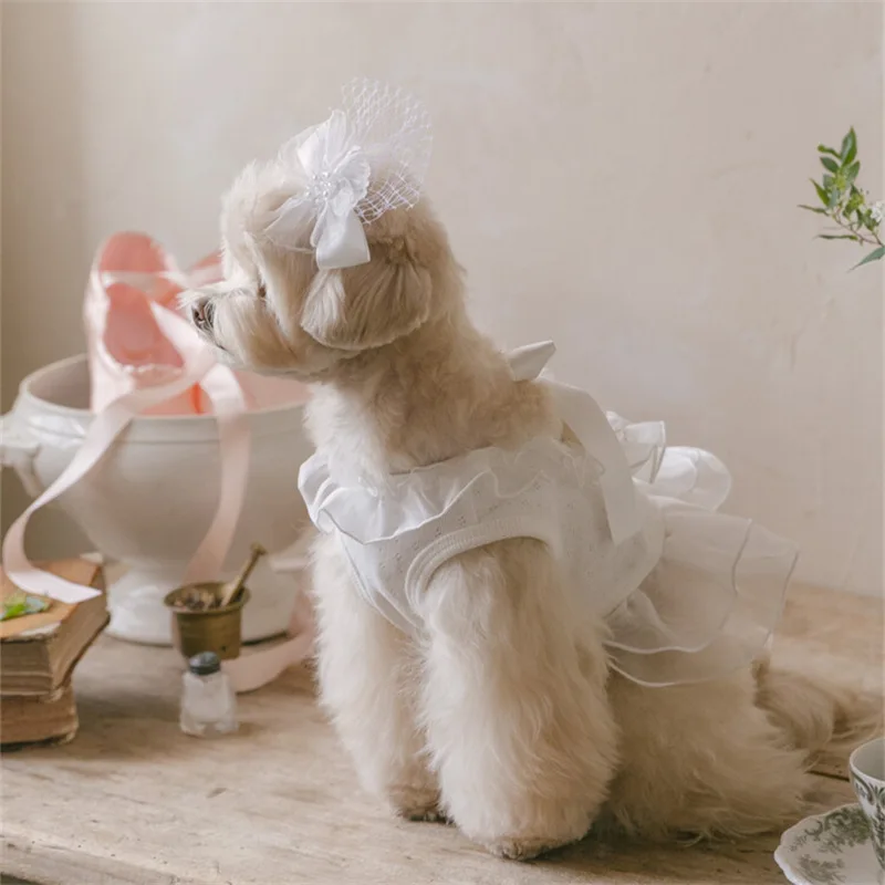 Chaleco hueco de primavera para mascotas, vestido de Estilo Princesa con volantes y lazo de malla tejida, falda esponjosa, diadema con lazo, ropa para cachorros