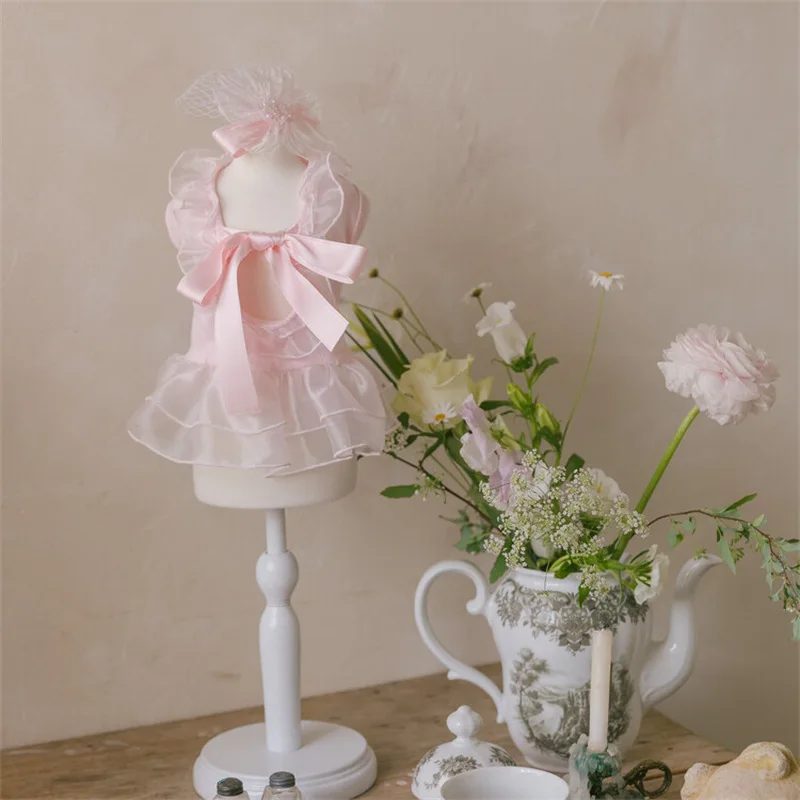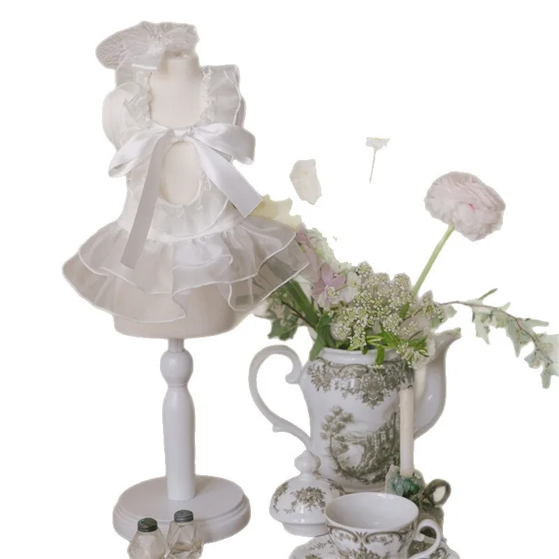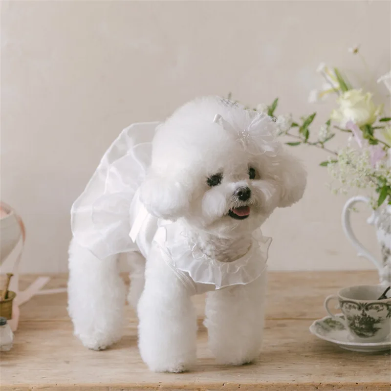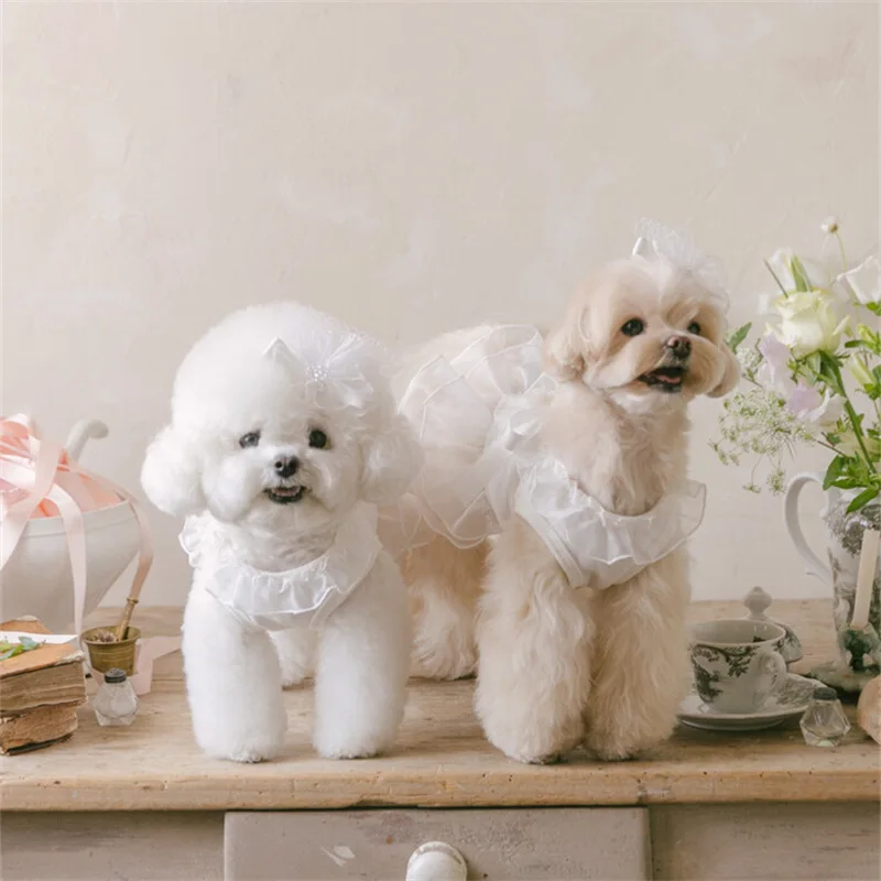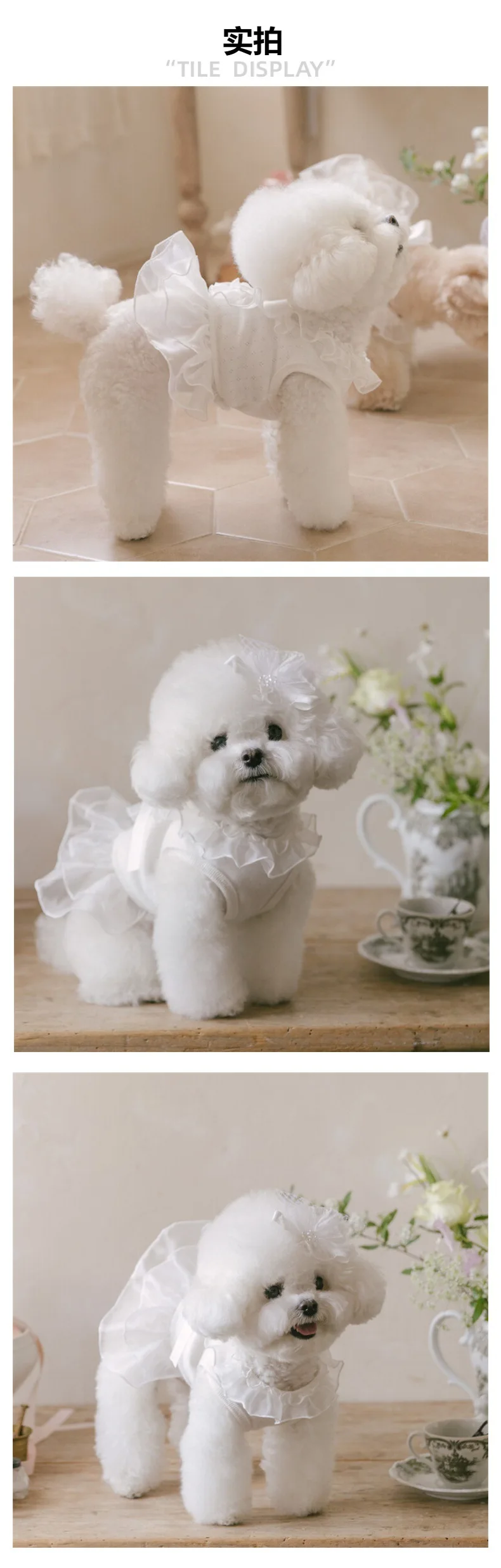 Chaleco hueco de primavera para mascotas, vestido de Estilo Princesa con volantes y lazo de malla tejida, falda esponjosa, diadema con lazo, ropa para cachorros