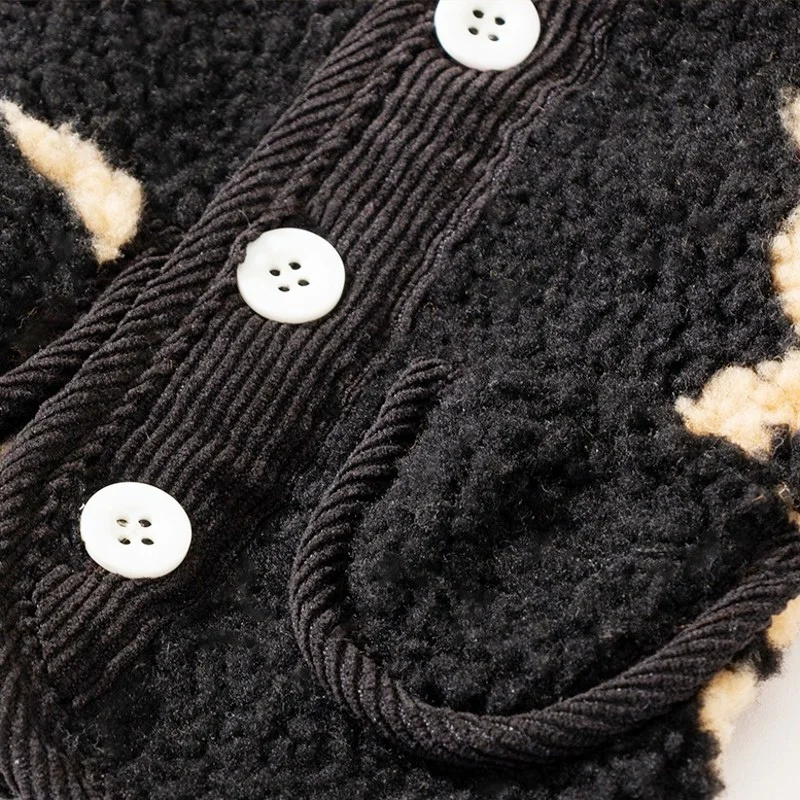 Característica:Chaleco tipo cárdigan con estampado de oso/Diseño de bolsillo a juego/Tejido suave y cómodo/Hermoso y cálido/Adición de terciopelo en el interior