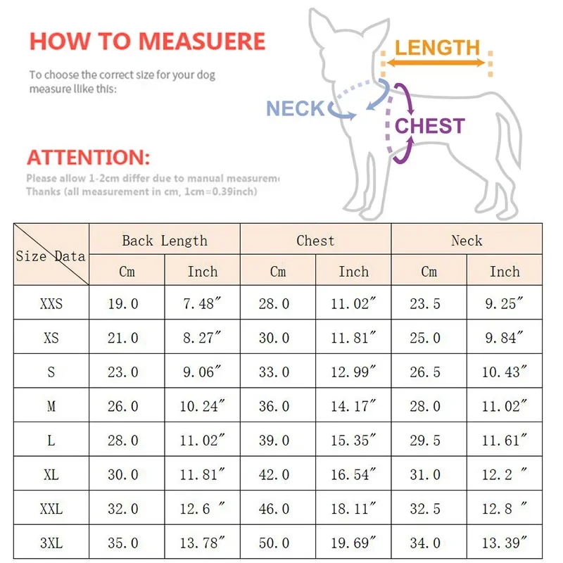 1. Por favor, compruebe las medidas de su mascota para asegurarse de que la ropa se ajuste a las mascotas antes de realizar el pedido (1 pulgada=2,54 cm)