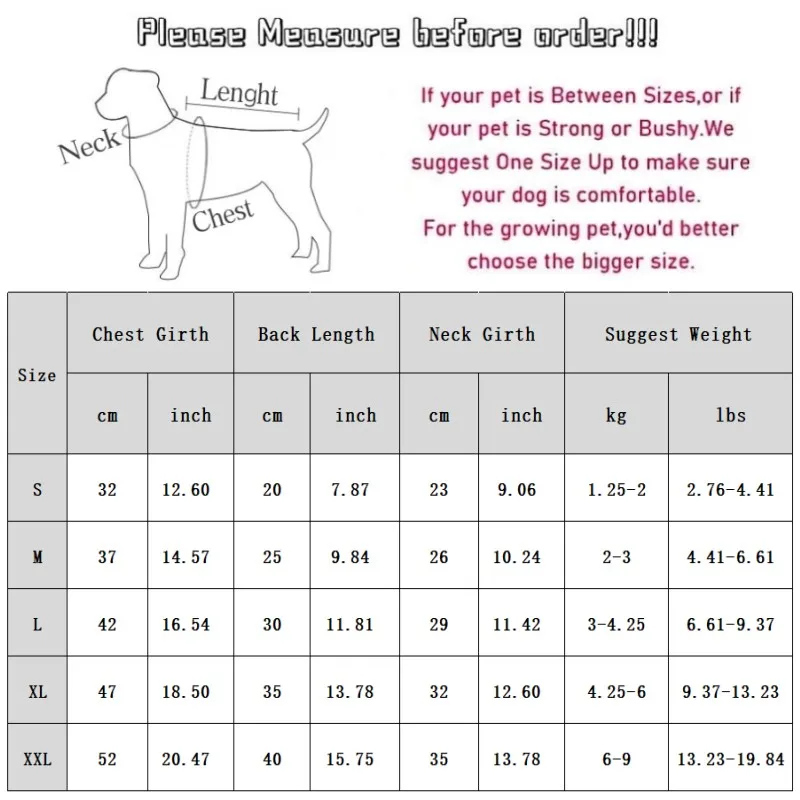 XXL: Pecho 52cm/20,47''; Longitud 40cm/15,75''; Cuello 35cm/13,78''; Peso sugerido 6-9 kg/13,23-19,84 libras.