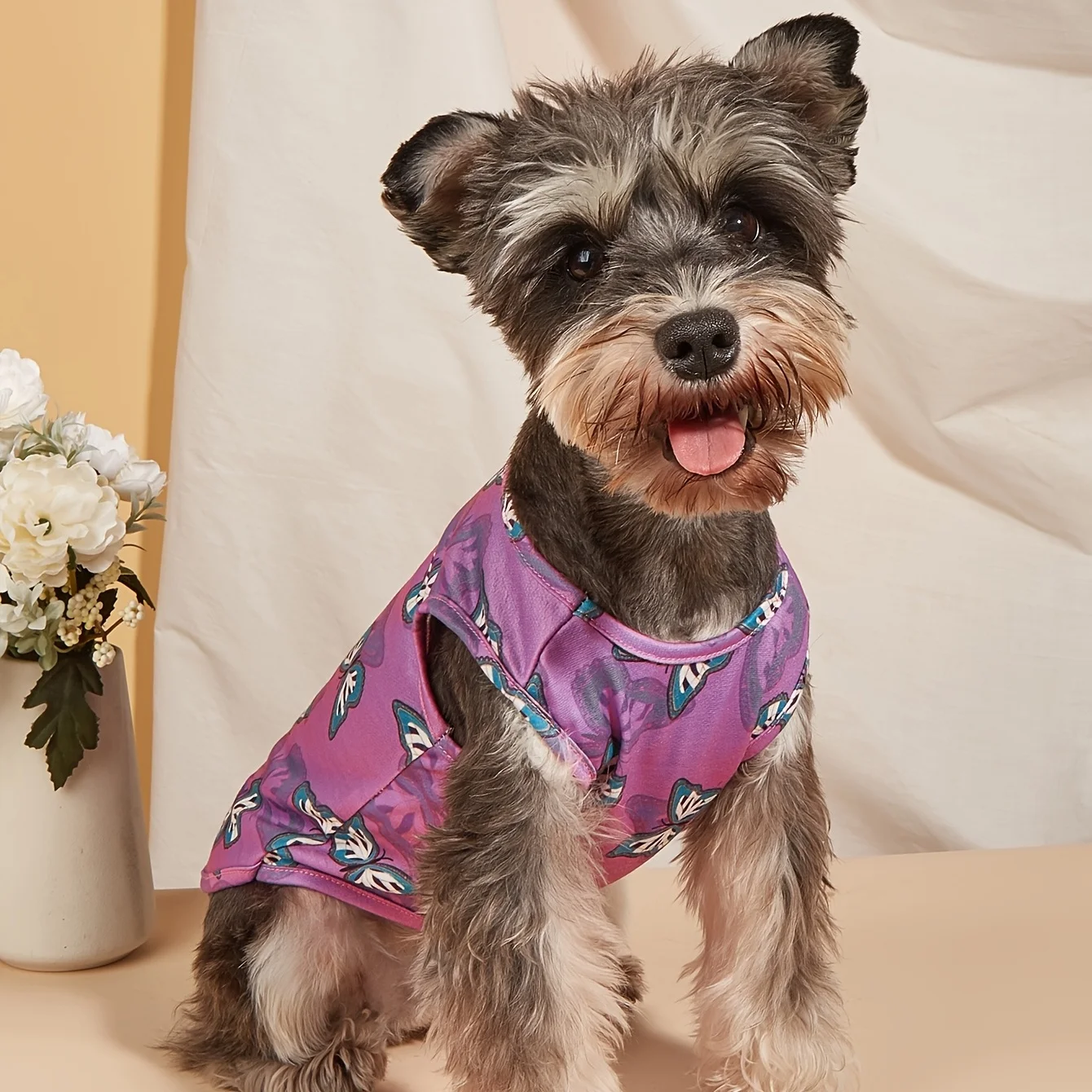 Chaleco morado para mascotas con estampado de mariposas azules, ropa para mascotas decorada con perlas, Top sin mangas bonito transpirable para perros pequeños/gatos de verano