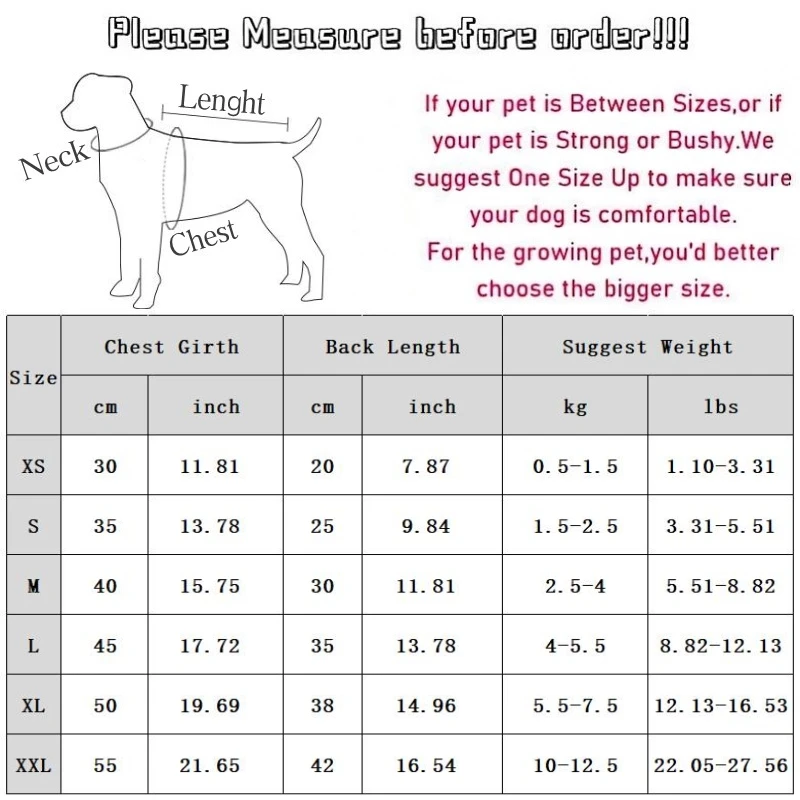 XL Circunferencia del pecho 50 cm/19,69 pulgadas; Longitud de la espalda 38 cm/14,96'; Peso sugerido 5,5,5 kg/12,12-16.53 libras
