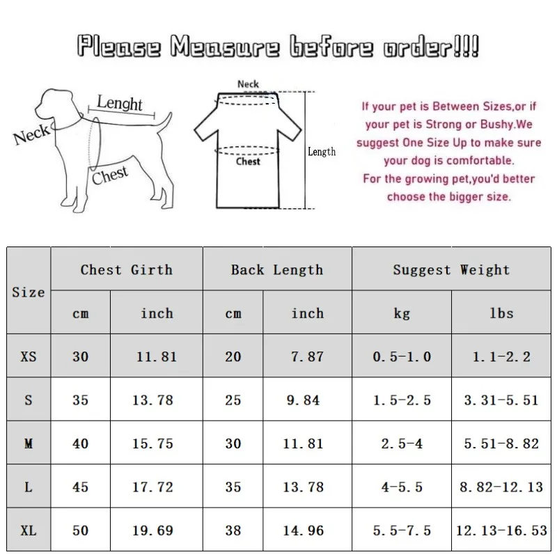 XS: Pecho 30 cm/11,81 "; Longitud 20 cm/7,87"; Peso sugerido 0,5-1,0 kg/1,1-2 lbs.