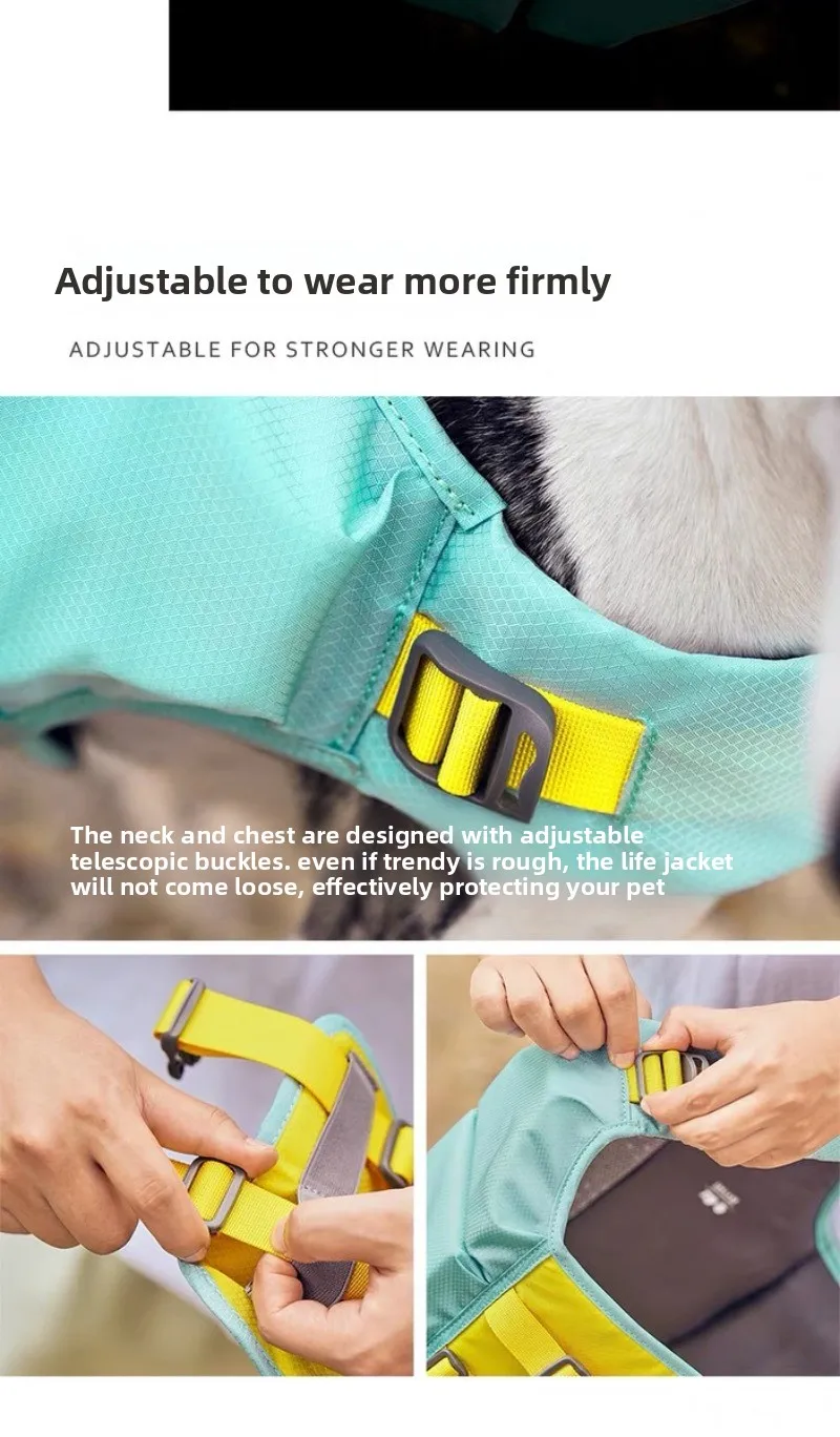 6.El cuello y el pecho están diseñados con hebillas telescópicas ajustables, incluso si la tendencia es turbulenta, el chaleco salvavidas no se soltará, protegiendo eficazmente a la mascota.