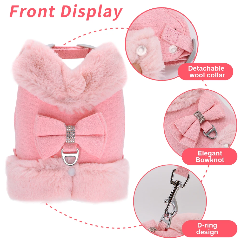 Chaleco suave y cálido para perros, conjunto de arnés y correa, lindo lazo, ropa de invierno para mascotas, chaleco de piel cálida, ropa para perros pequeños, Bulldog Francés, rosa