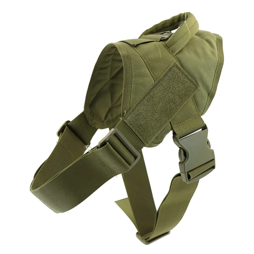 La correa delantera para el pecho del arnés militar para perros se puede ajustar bidireccional mediante 2 ajustadores deslizantes, la correa estaba hecha de correas de nailon de 2 capas, correas de ancho y grosor adecuados que pueden ofrecer una fuerte resistencia y una sensación cómoda al cuello del perro..