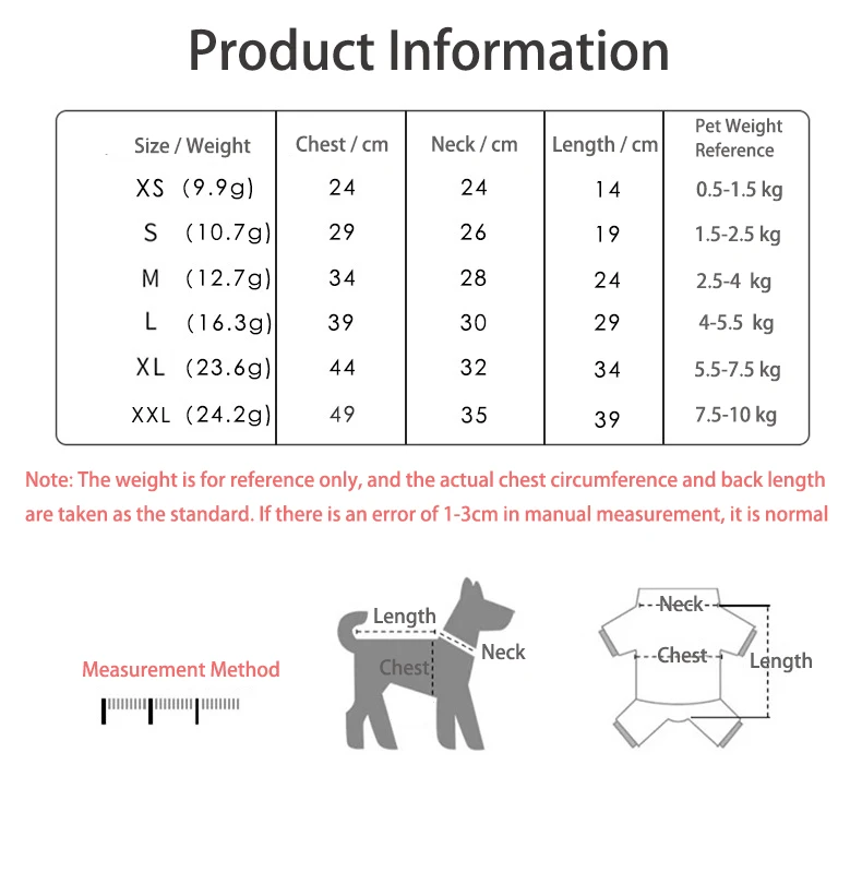 2.Para la ropa de dos piernas, preste atención a la circunferencia del pecho, y para las cuatro piernas, debe adaptarse a la circunferencia del pecho y la longitud de la espalda.
